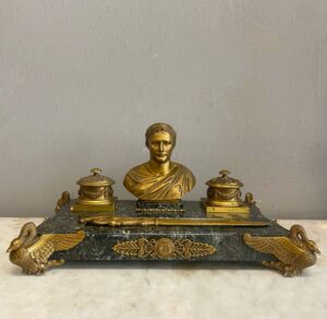 Calamaio in bronzo dorato e marmo.