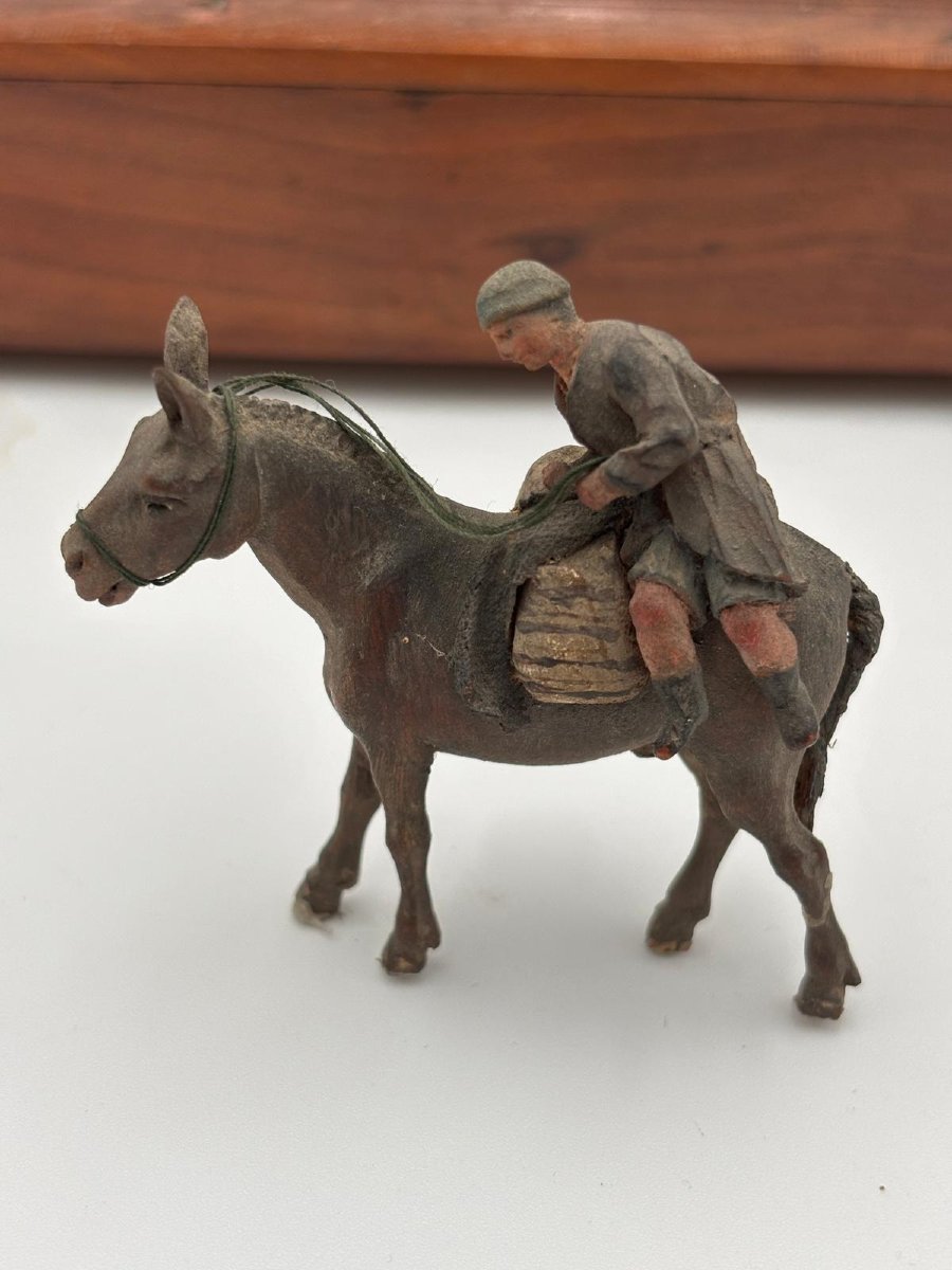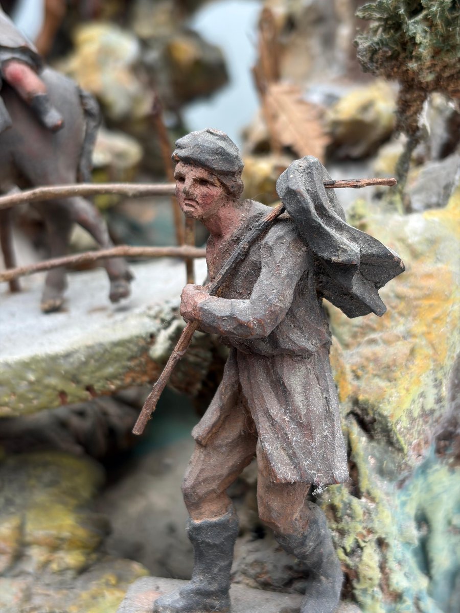 Importante gruppo presepiale siciliano composto da 24 figure, realizzate a fine XVII – inizi XVIII secolo, attribuibili alla bottega di Giovanni Antonio Matera (Trapani, 1653–1718), uno dei più raffinati maestri del presepe barocco siciliano. Le figure, alte circa 10 cm, presentano tutte le caratteristiche della produzione trapanese seicentesca: • teste, mani e piedi in terracotta policroma; • corpi modellati con anima in filo di ferro; • panneggi in stoffa irrigidita con impasto gessoso, tipici della scuola siciliana del periodo barocco; • alcuni personaggi interamente scolpiti in legno, tecnica riscontrabile nei lavori più antichi della bottega Matera. Gli animali, alti tra 5 e 7 cm, sono tutti in legno scolpito, inclusi cavalli, pecore, capre e bovini. L’intaglio accurato e le proporzioni rimandano direttamente alla produzione della bottega trapanese della fine del Seicento, rendendo il nucleo particolarmente raro e ricercato. Composizione del gruppo: • Sacra Famiglia • Re Magi • numerosi pastori e viandanti • diversi animali scolpiti in legno • figure minori e scene di vita rurale per un totale di 24 elementi antichi. La scenografia (montagna, basamento e architetture) è di realizzazione successiva, databile ai primi decenni del XX secolo, e funge da supporto espositivo alle figure originali. Condizioni: buone condizioni generali, con normali tracce del tempo compatibili con l’epoca. Provenienza: collezione privata siciliana. Opera di grande fascino e rarità, ideale per collezionisti di presepi antichi, arte barocca siciliana e scultura devozionale del Sud Italia. MISURE • Figure: 10 cm • Animali: 5–7 cm (Per ulteriori foto chiedere in privato)