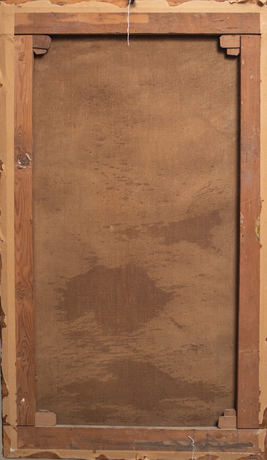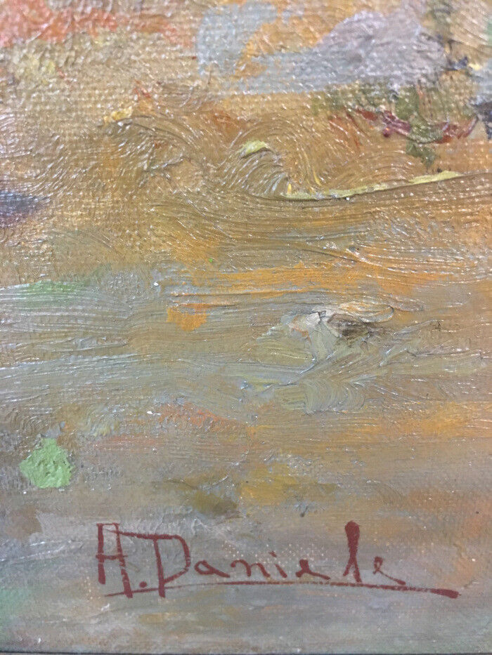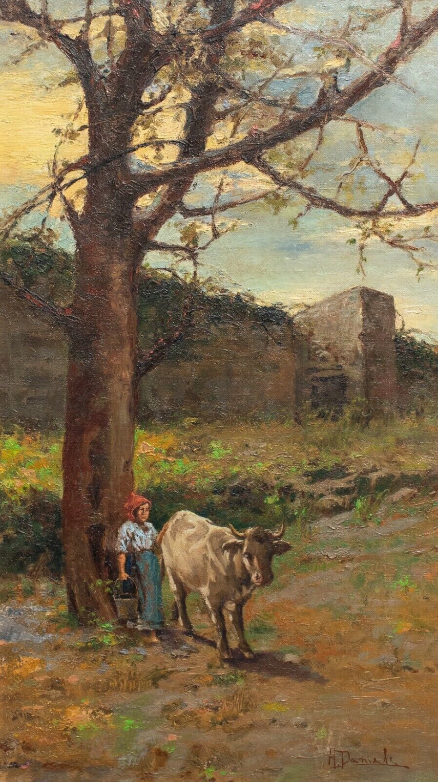 Olio su tela ritraente paesaggio campestre, con contadina.La protagonista ed anche unico soggetto della tela, è la stanca contadina che con delicatezza accarezza la sua vacca e con l’altra mano sorregge un secchiello contenente con molta probabilità, come si può facilmente immaginare, il latte appena munto.Il tutto avviene nella natura, capeggiata per lo più da un grande albero sfoglio.Il paesaggio è incastonato da un muro di cinta, in cui si trova una piccola costruzione.La tecnica pittorica è caratterizzata dall’ uso di pennellate, dai tocchi non troppo precisi, ma vivi di colore.