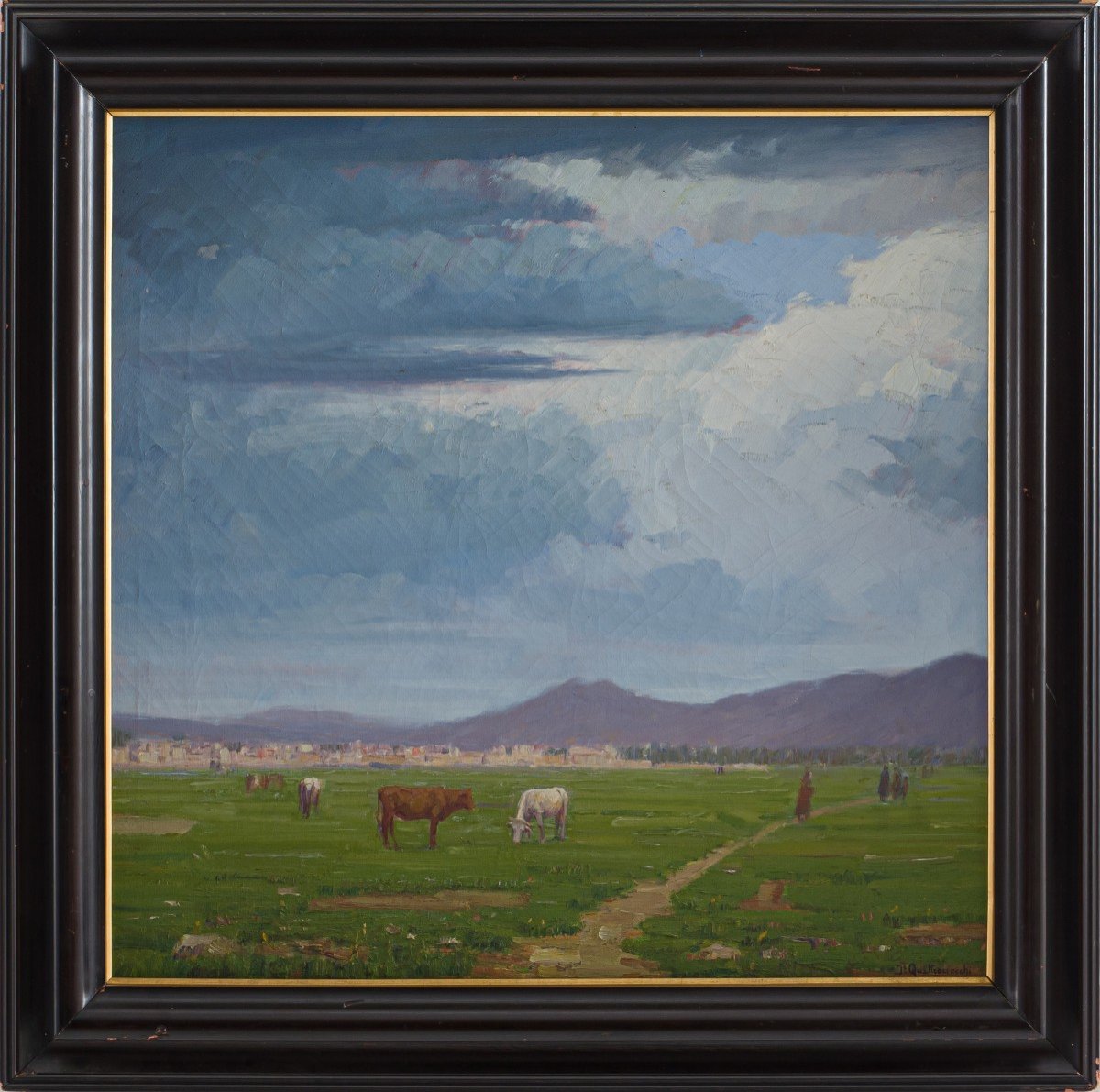 Mucche al pascolo con la città di Palermo sullo sfondo. Olio su tela firma in basso a destra con cornice in legno ebanizzato.