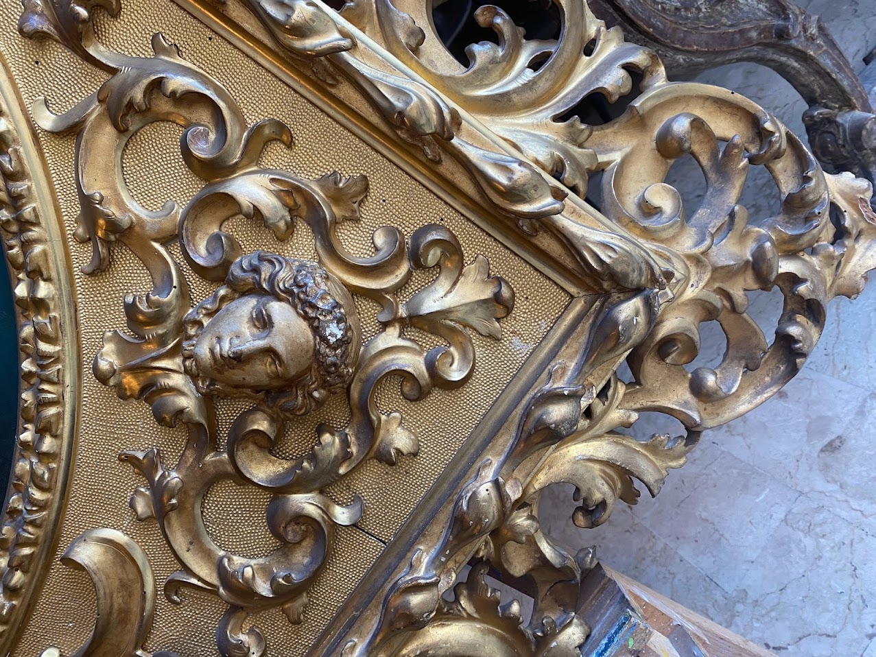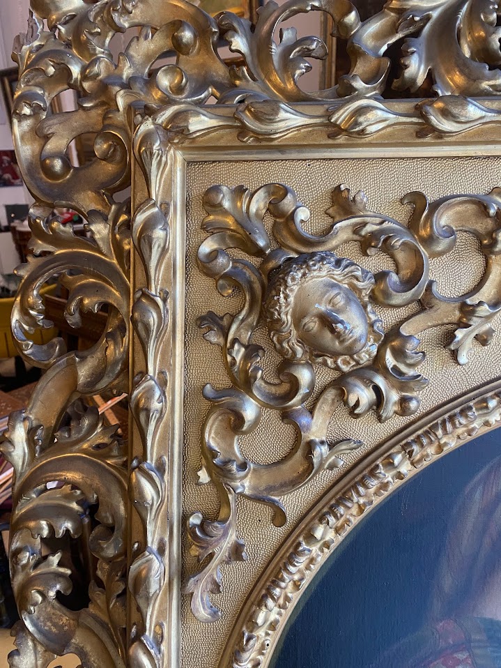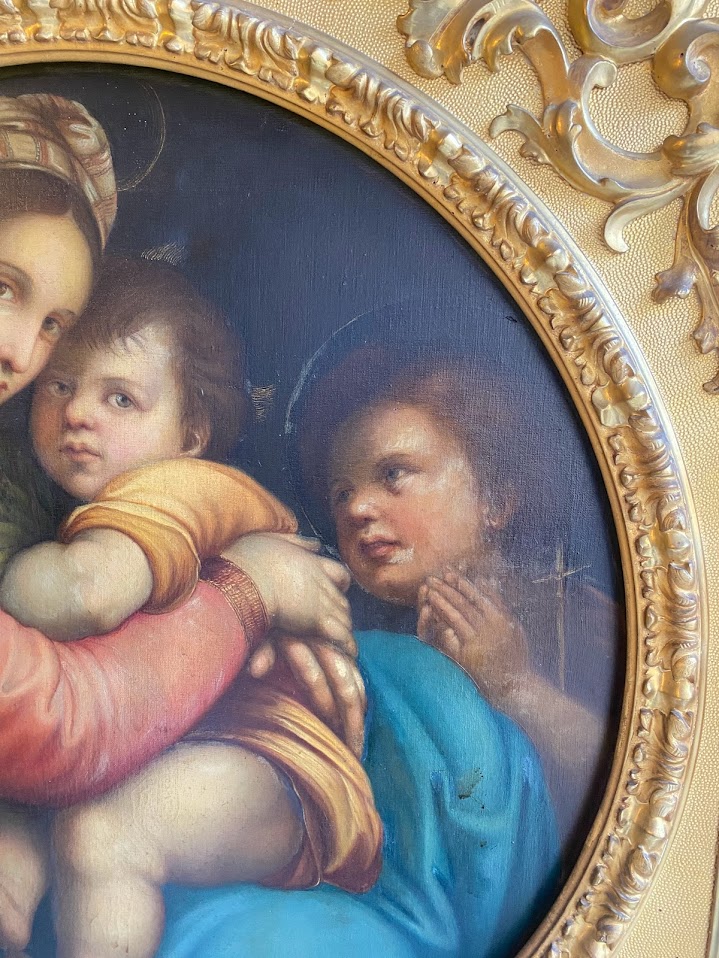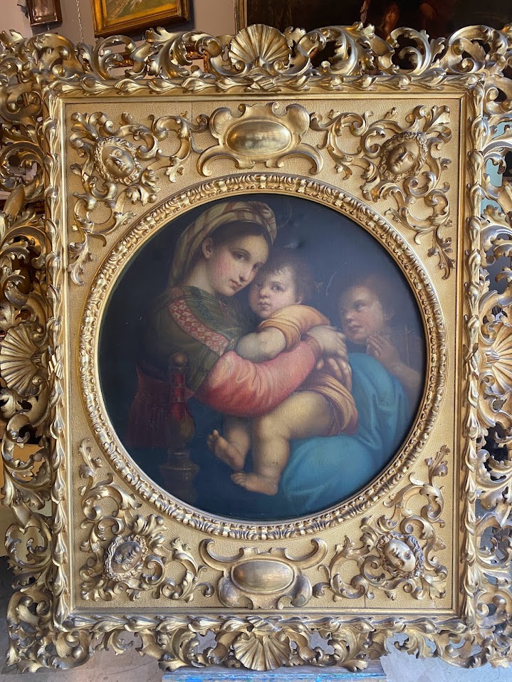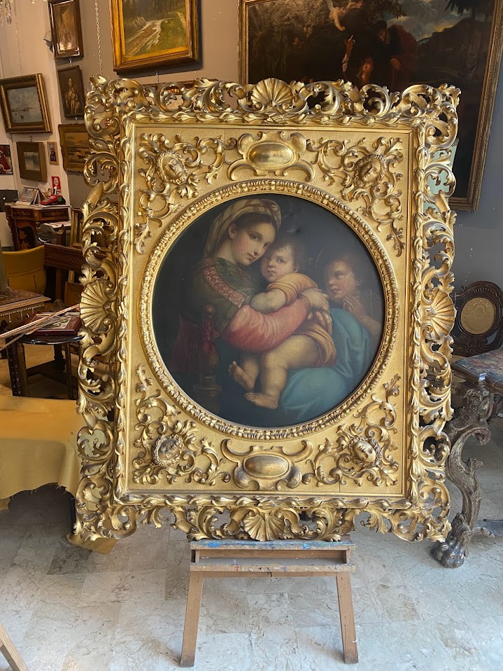Olio su tela raffigurante “Madonna della seggiola” con importante cornice in legno intagliata e dorata del XIX secolo.