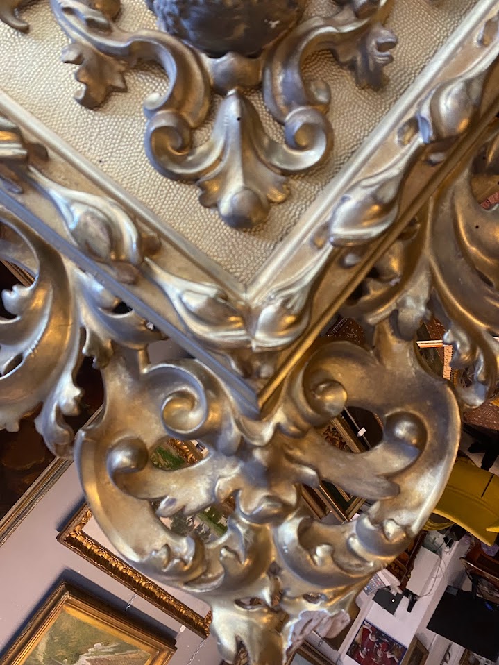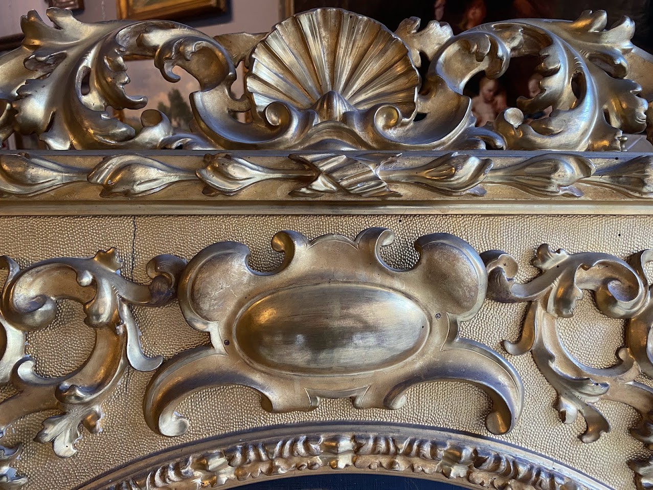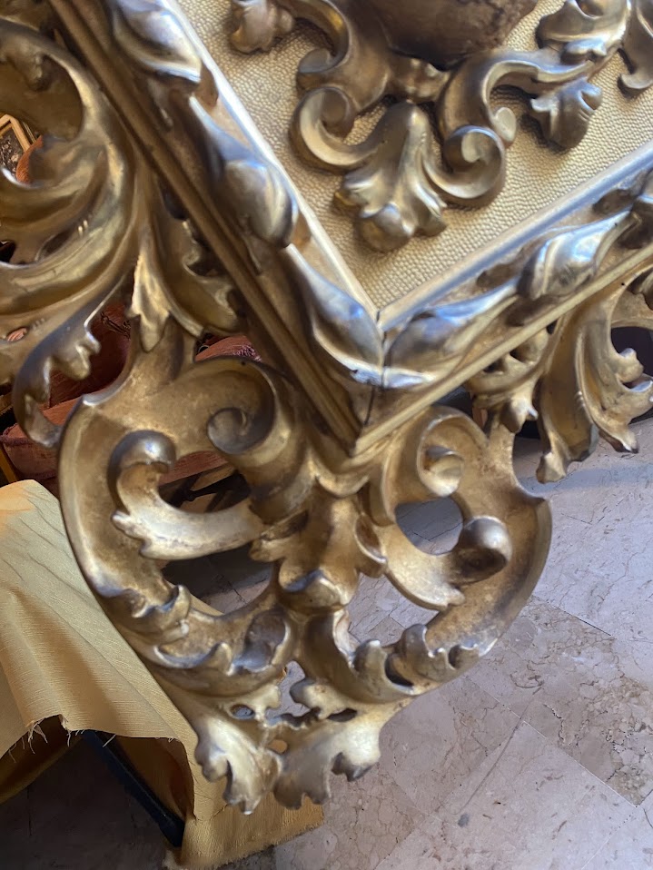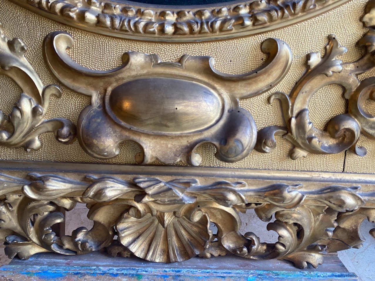 Olio su tela raffigurante “Madonna della seggiola” con importante cornice in legno intagliata e dorata del XIX secolo.