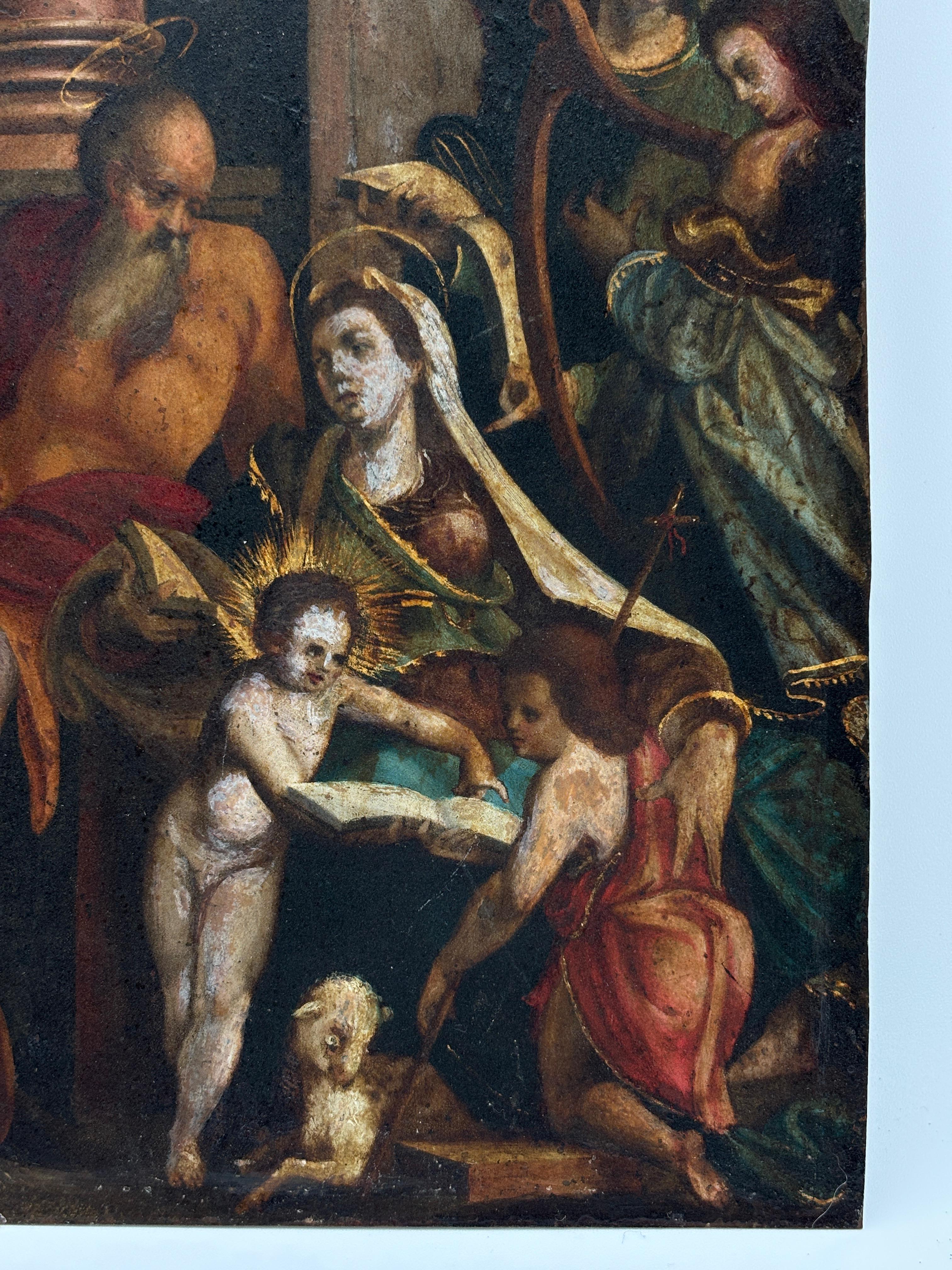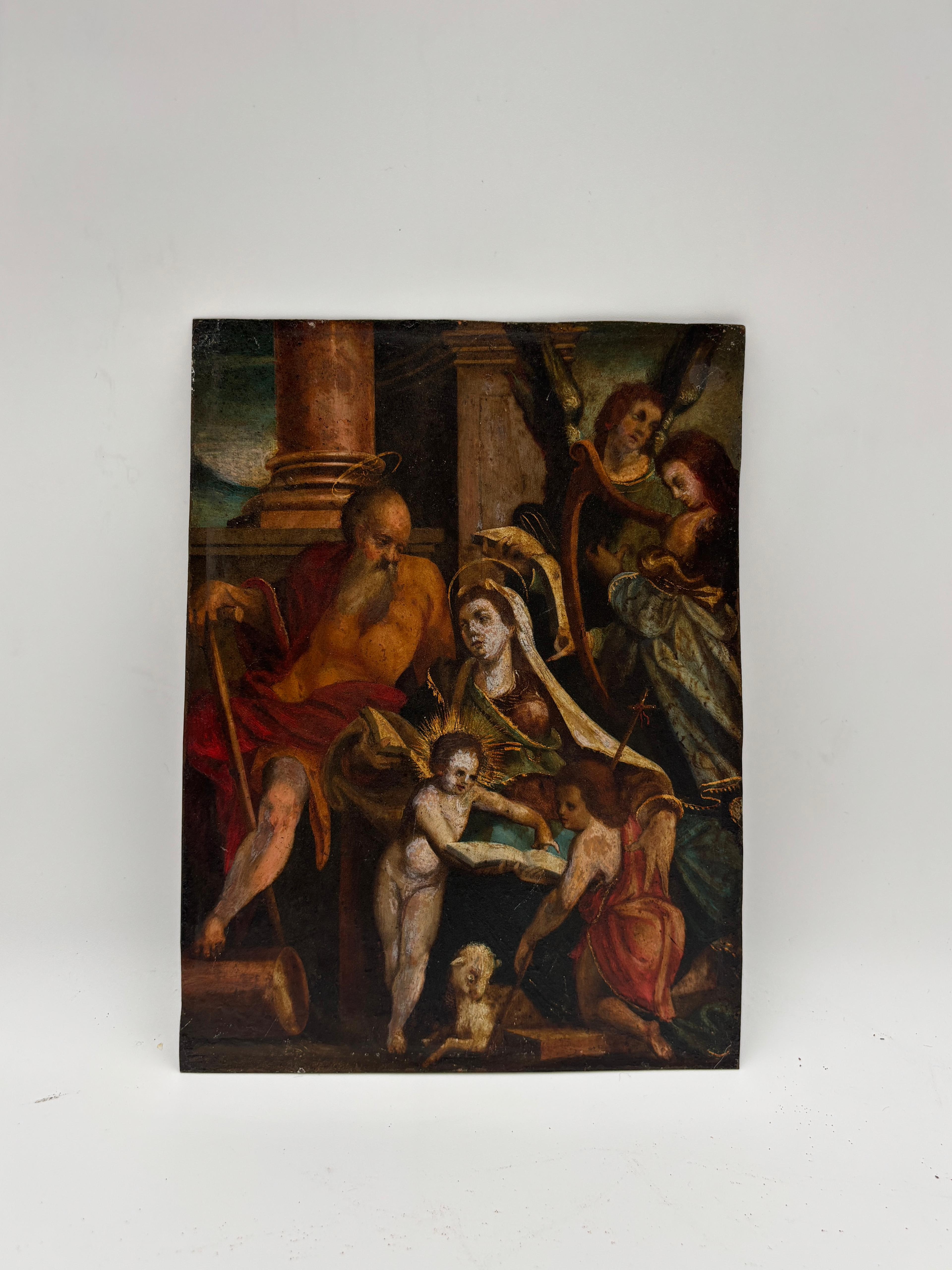 Per stile e qualità, l’opera è accostabile alla cerchia di Palma il Giovane (Jacopo Negretti, 1548–1628), prolifico maestro veneziano attivo a cavallo tra XVI e XVII secolo, che fece largo uso di supporti in rame per opere devozionali di piccolo e medio formato. La resa vigorosa di San Giuseppe e la dolcezza dei volti femminili sono affini a soluzioni iconografiche diffuse dalla sua bottega e da artisti coevi nell’Italia settentrionale.