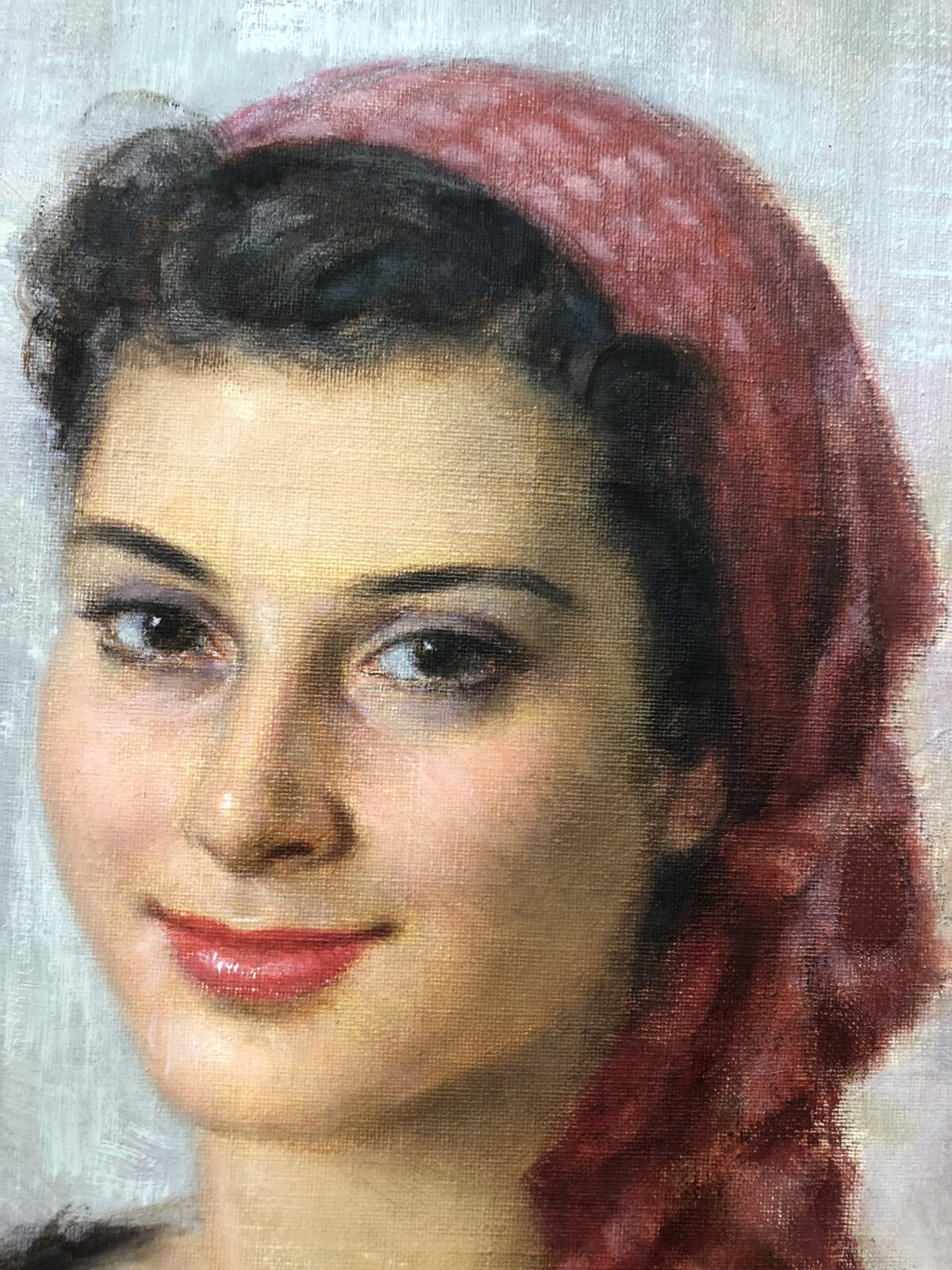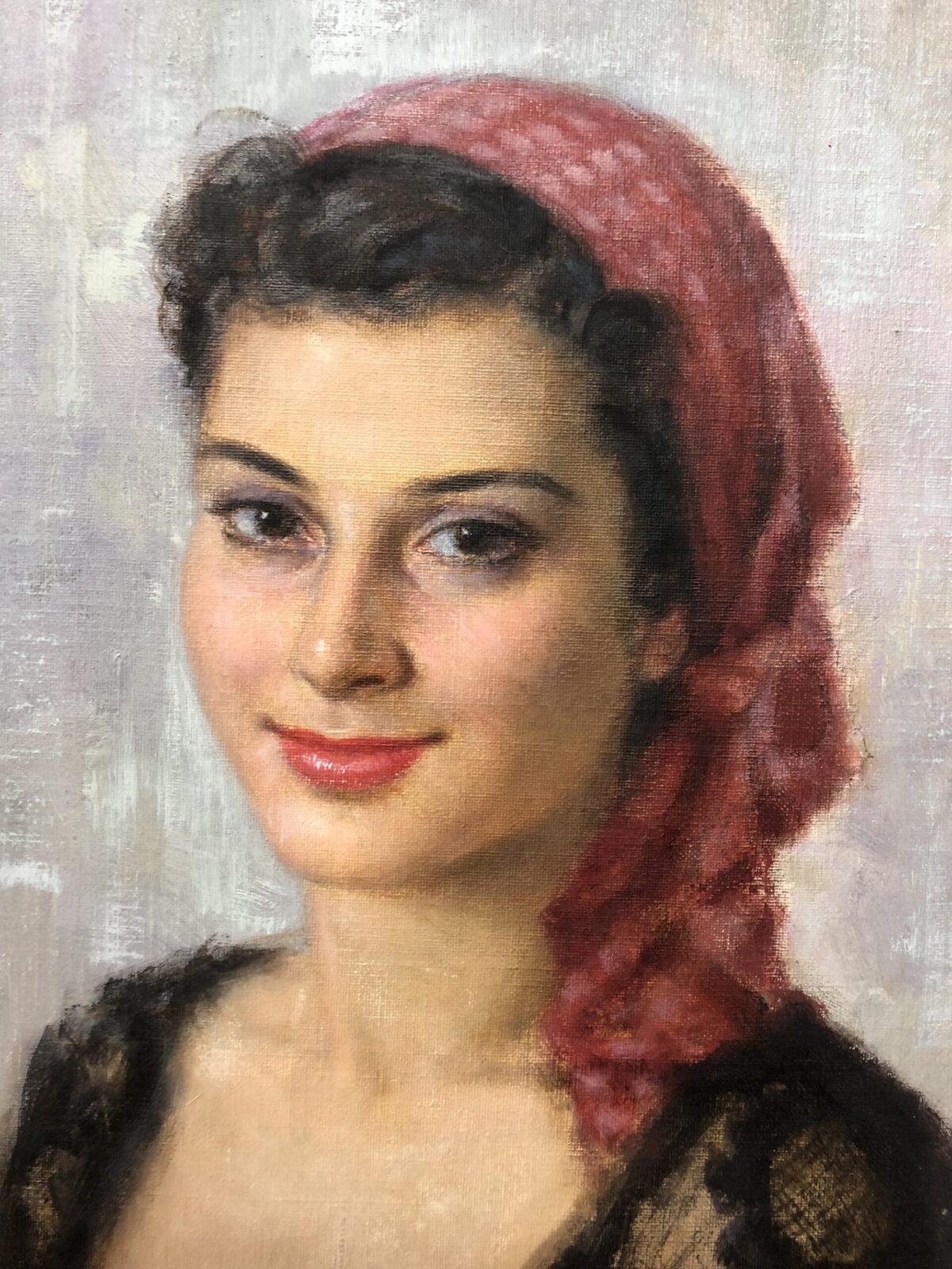 La donna sfoggia un sorriso affabile, contornato dal rosso vivace delle labbra, lo sguardo si rivela intenso e attento, i bruni capelli, invece, sono raccolti in un foulard a pois.