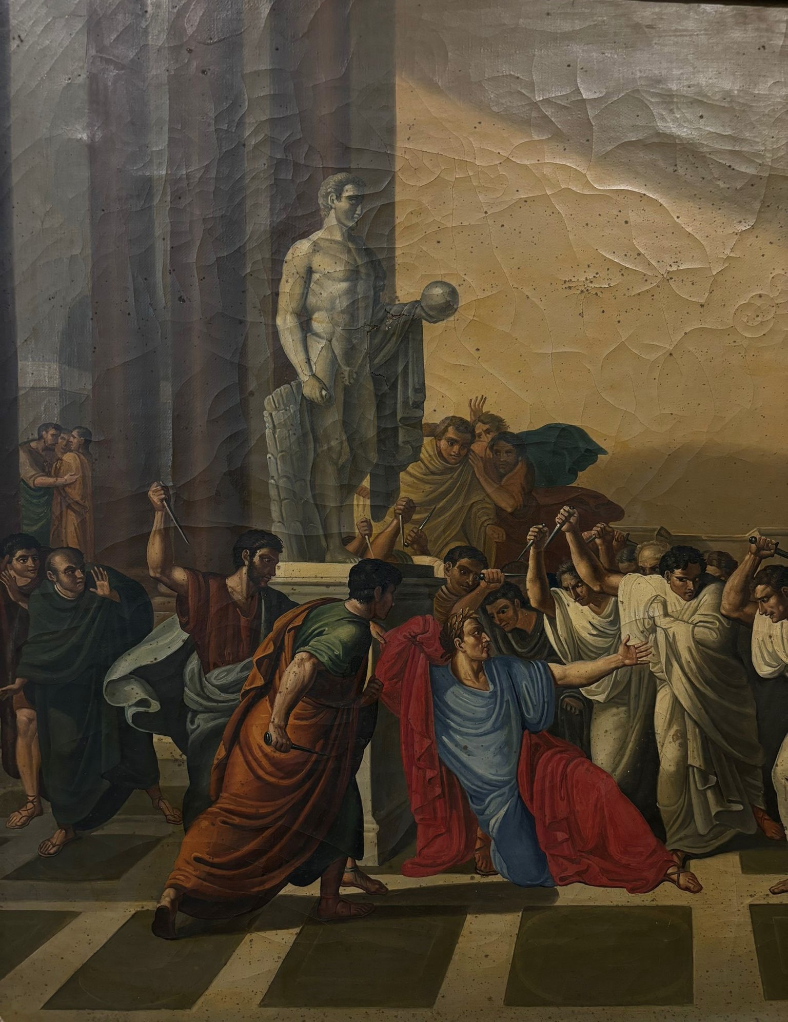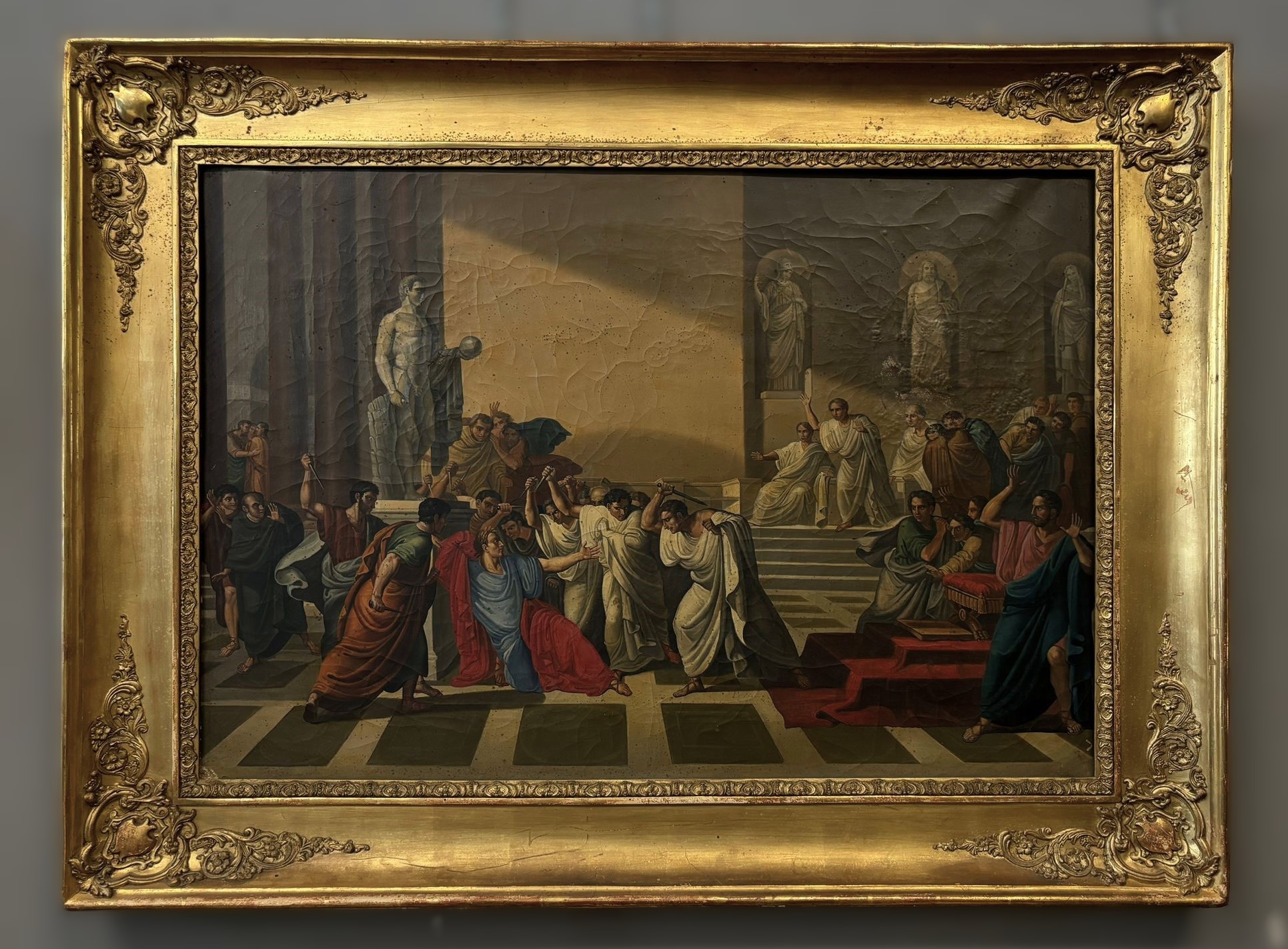 Olio su tela raffigurante la morte di Cesare, con cornice in legno dorata a foglia in oro zecchino. Dimensioni: 88 x 118 cm