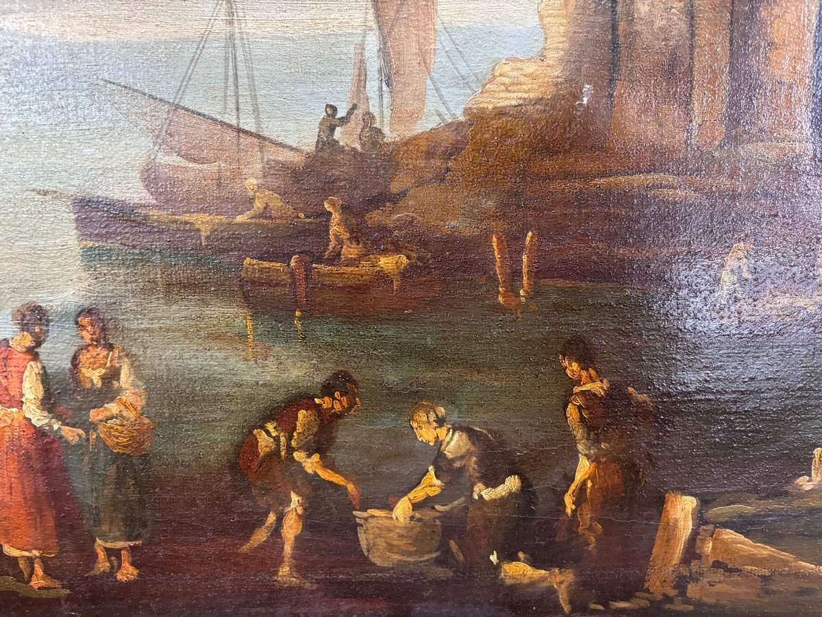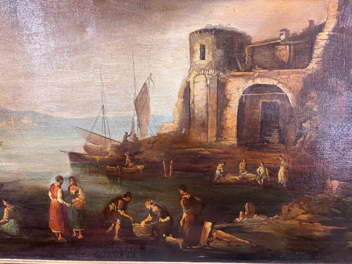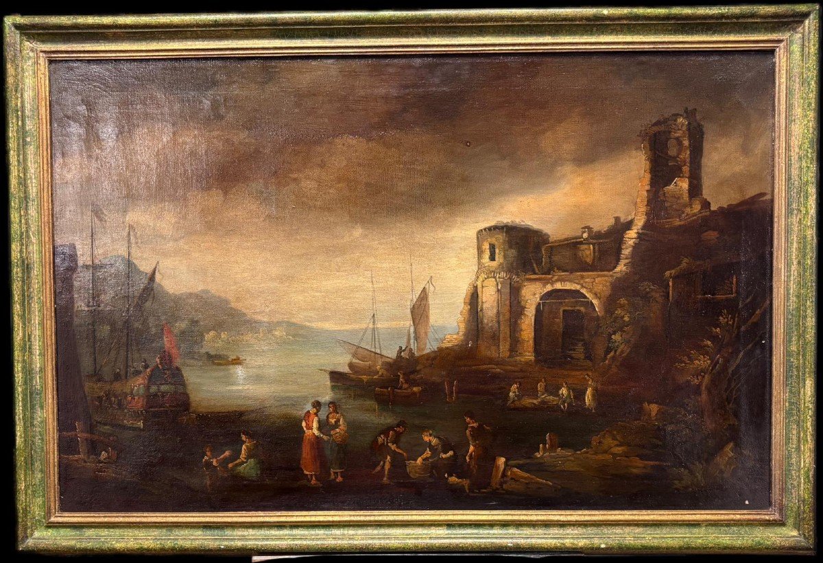 Dipinto a olio su tela raffigurante veduta di porto con personaggi, pittore accademico degli inizi del XIX secolo italiano.