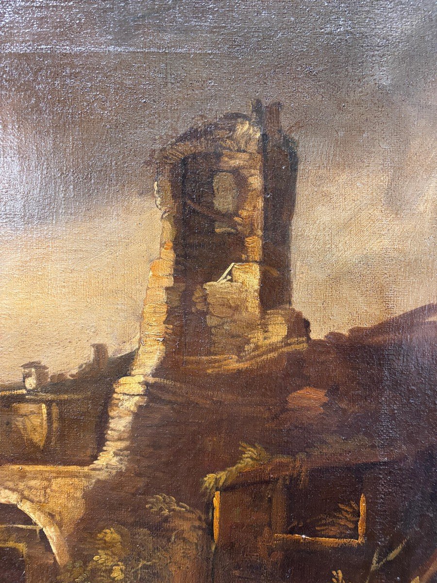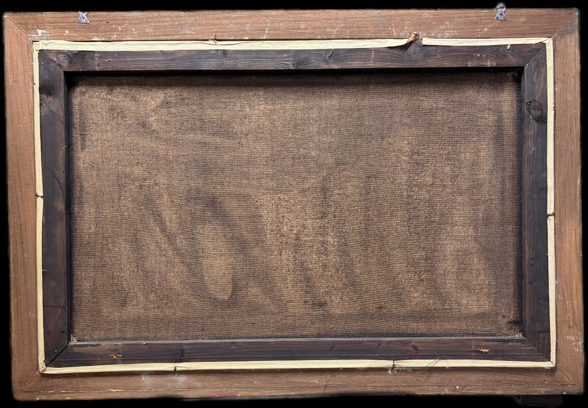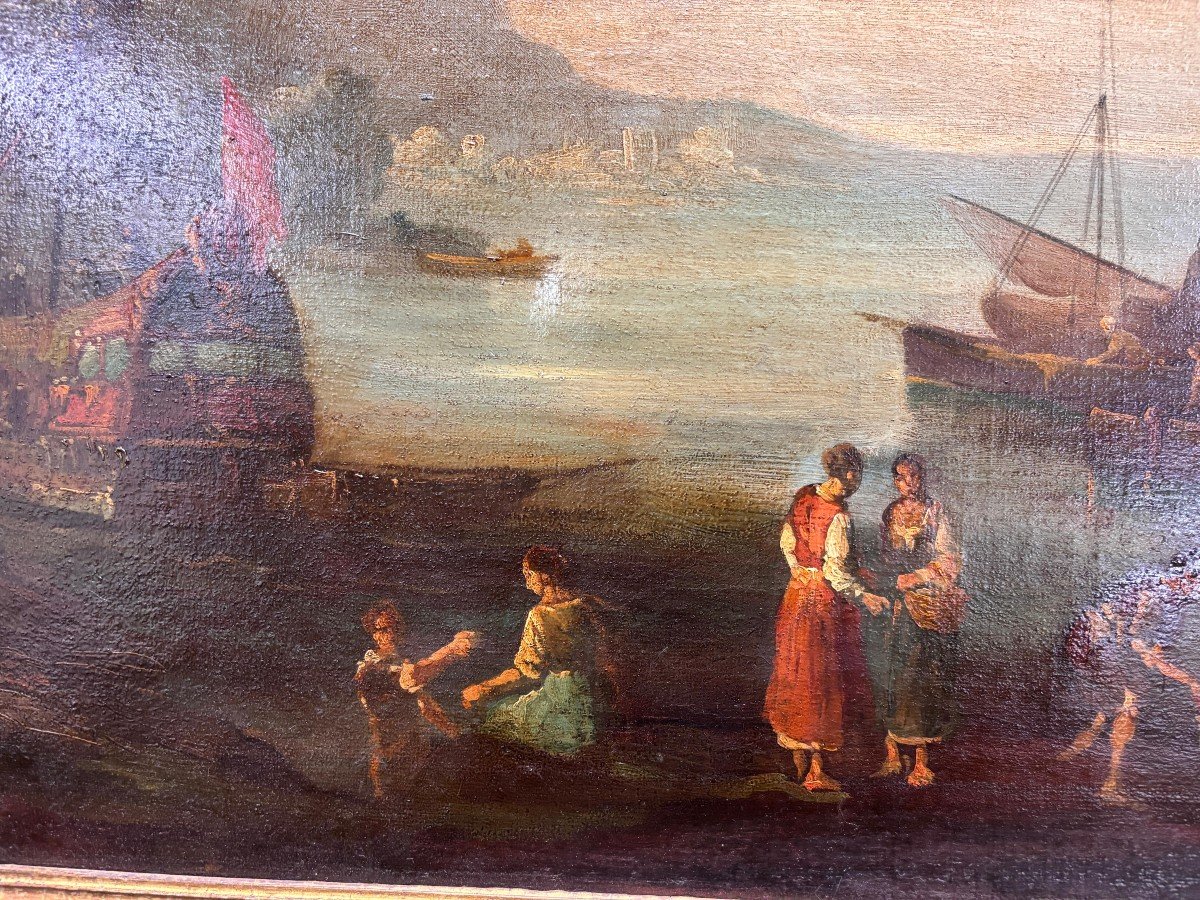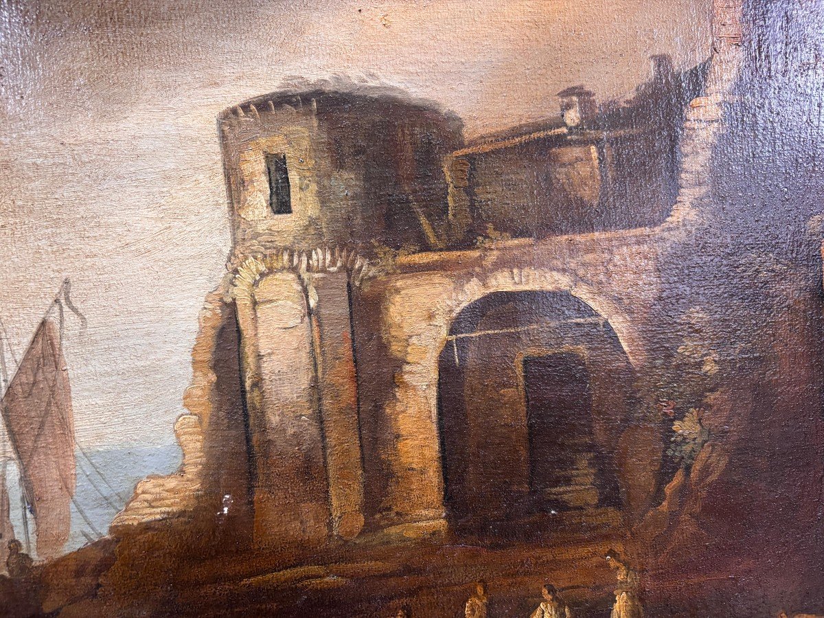 Dipinto a olio su tela raffigurante veduta di porto con personaggi, pittore accademico degli inizi del XIX secolo italiano.