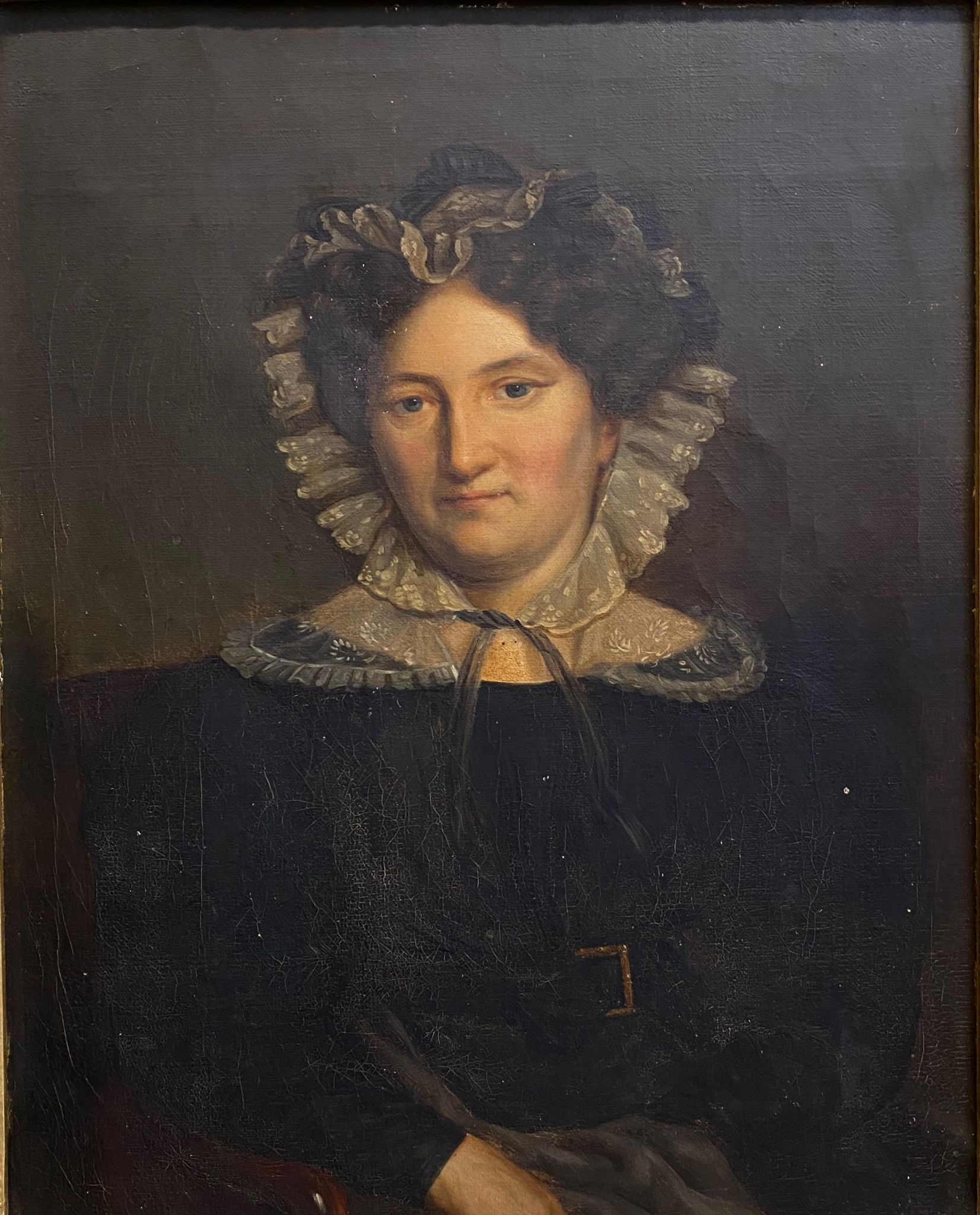 Olio su tela con cornice impero dorata a foglia oro zecchino, raffigurante ritratto di nobil donna della metà del XIX sec.