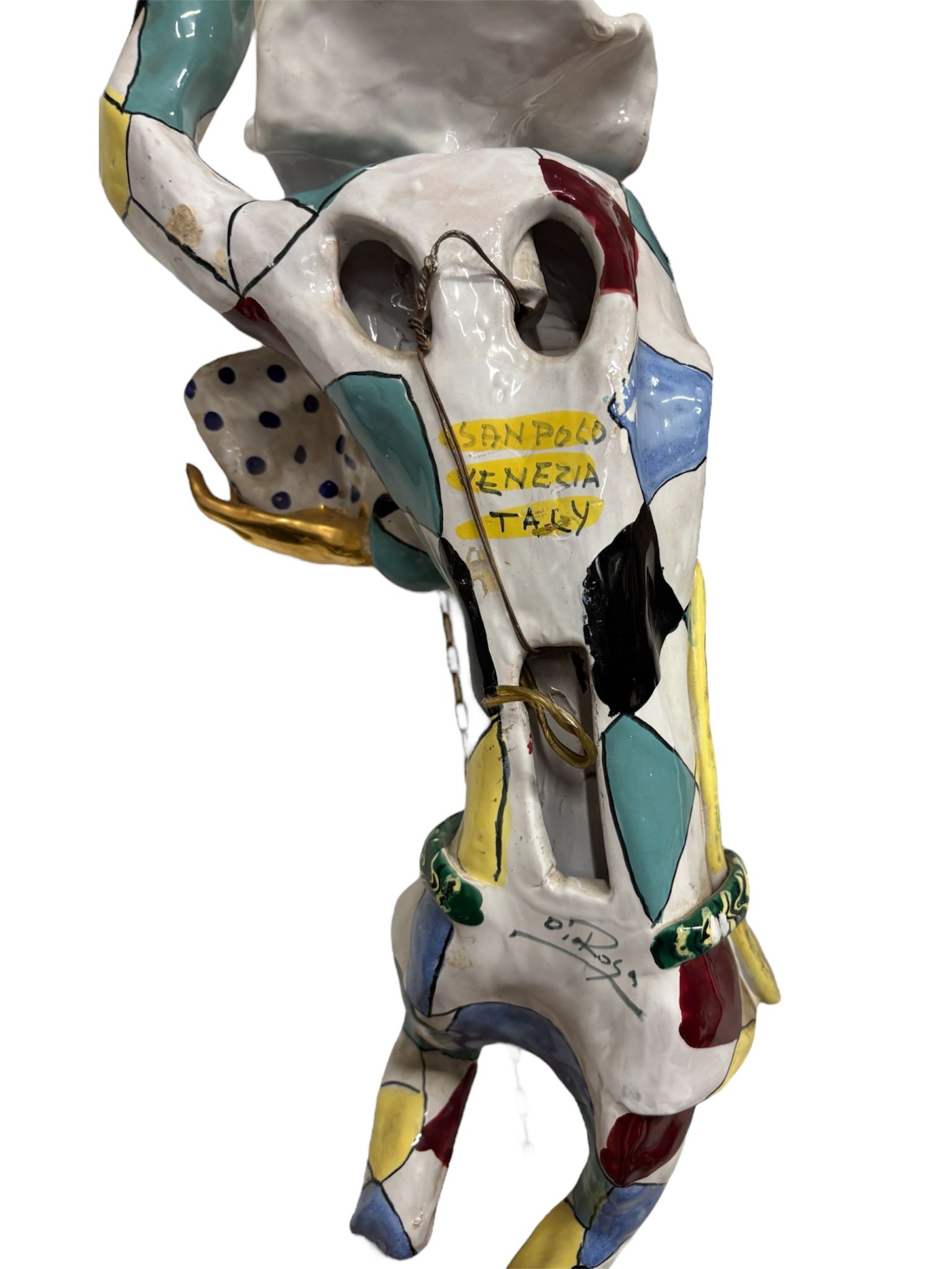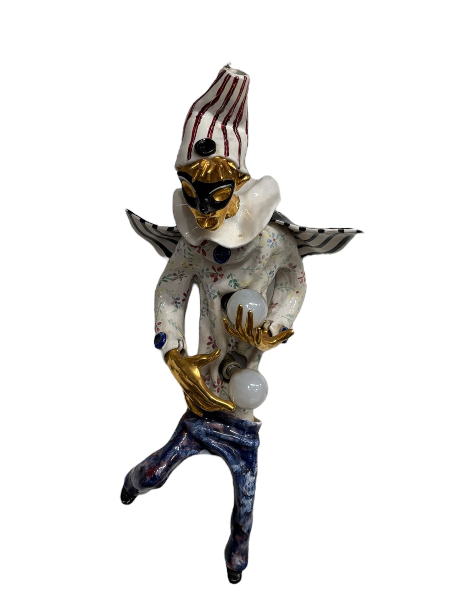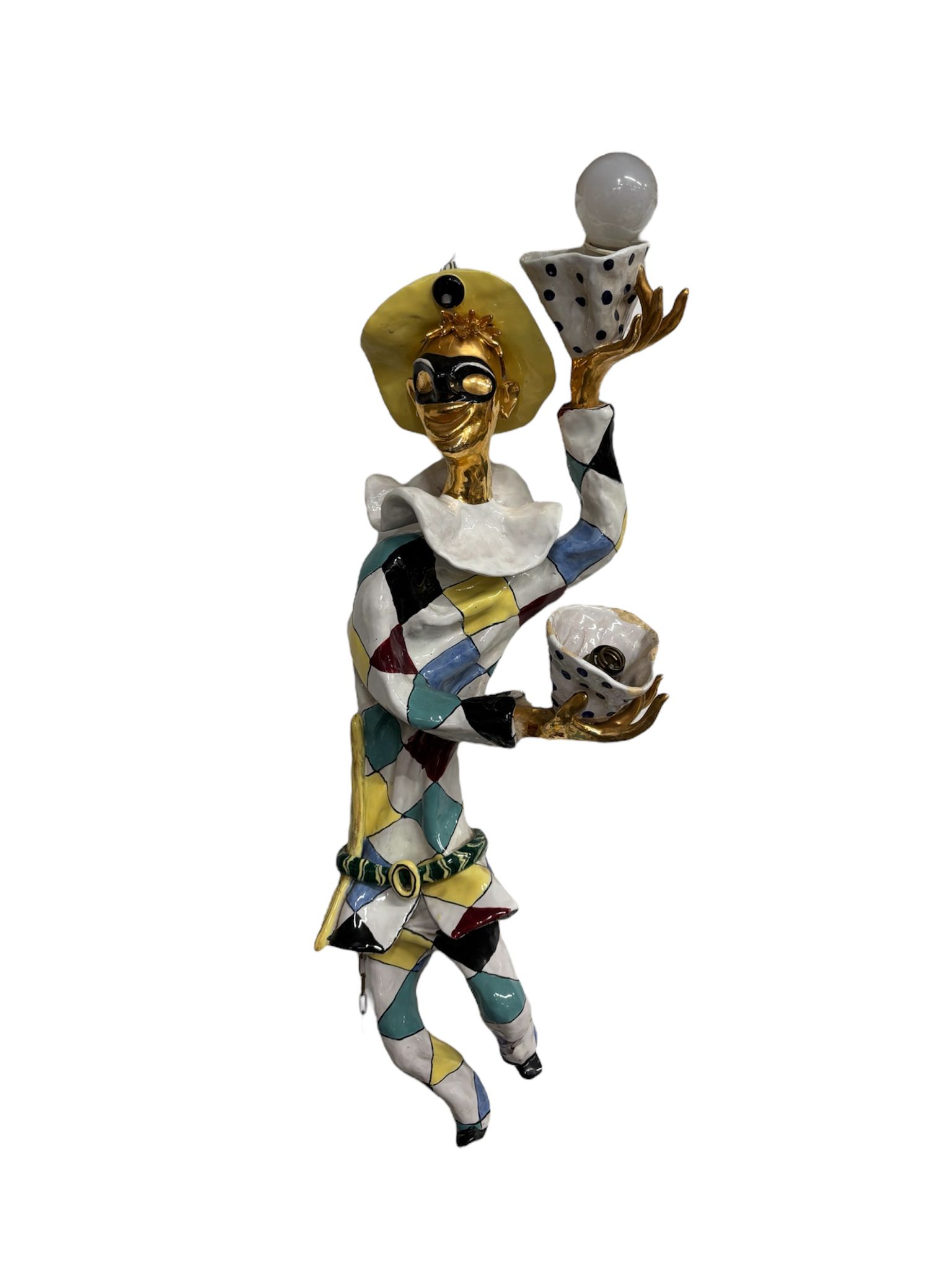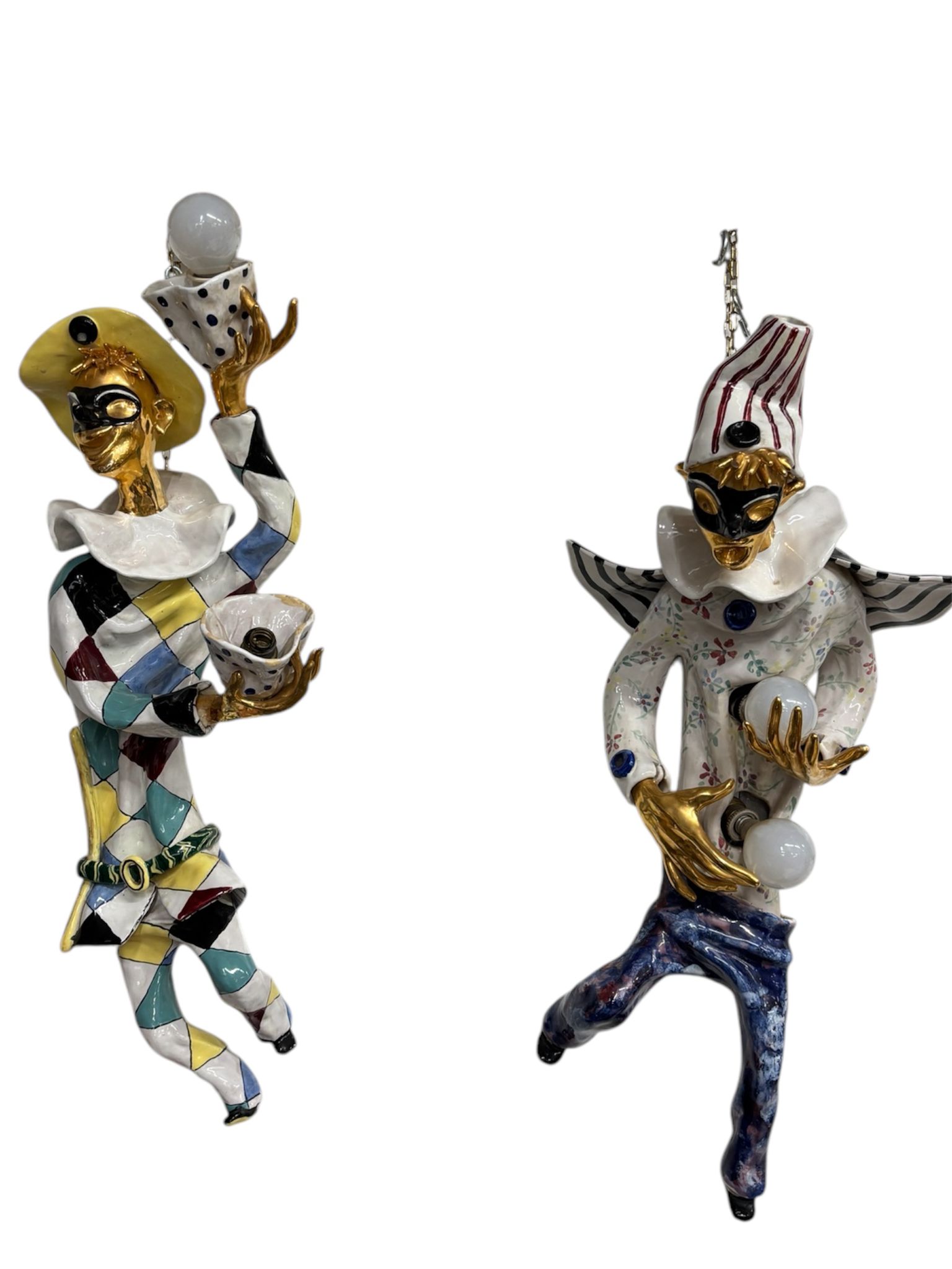 Rara coppia di aplique a due luci in ceramica policroma, raffiguranti arlecchino , firmate nel retro O. Rosa San Paolo Venezia Italy