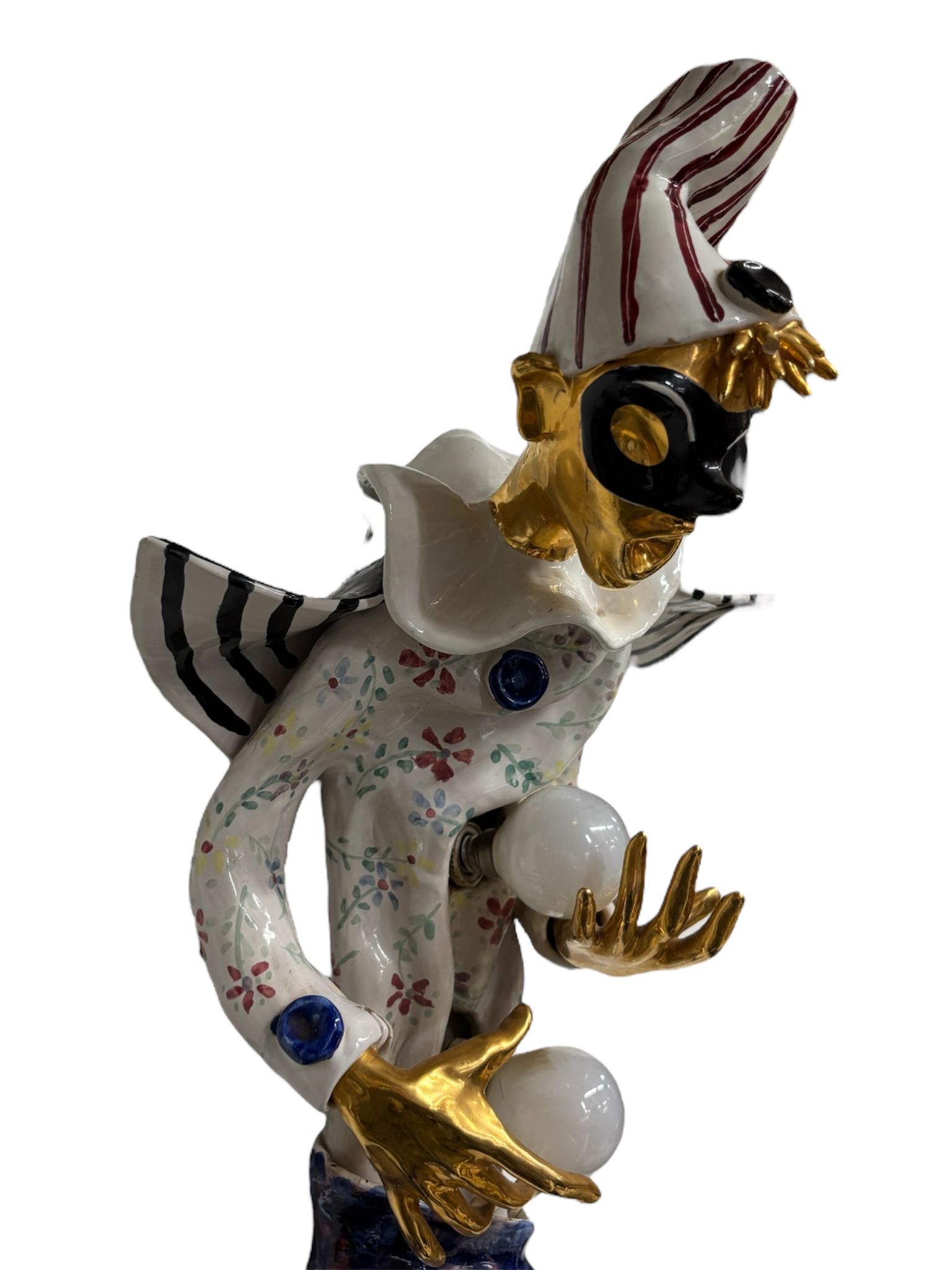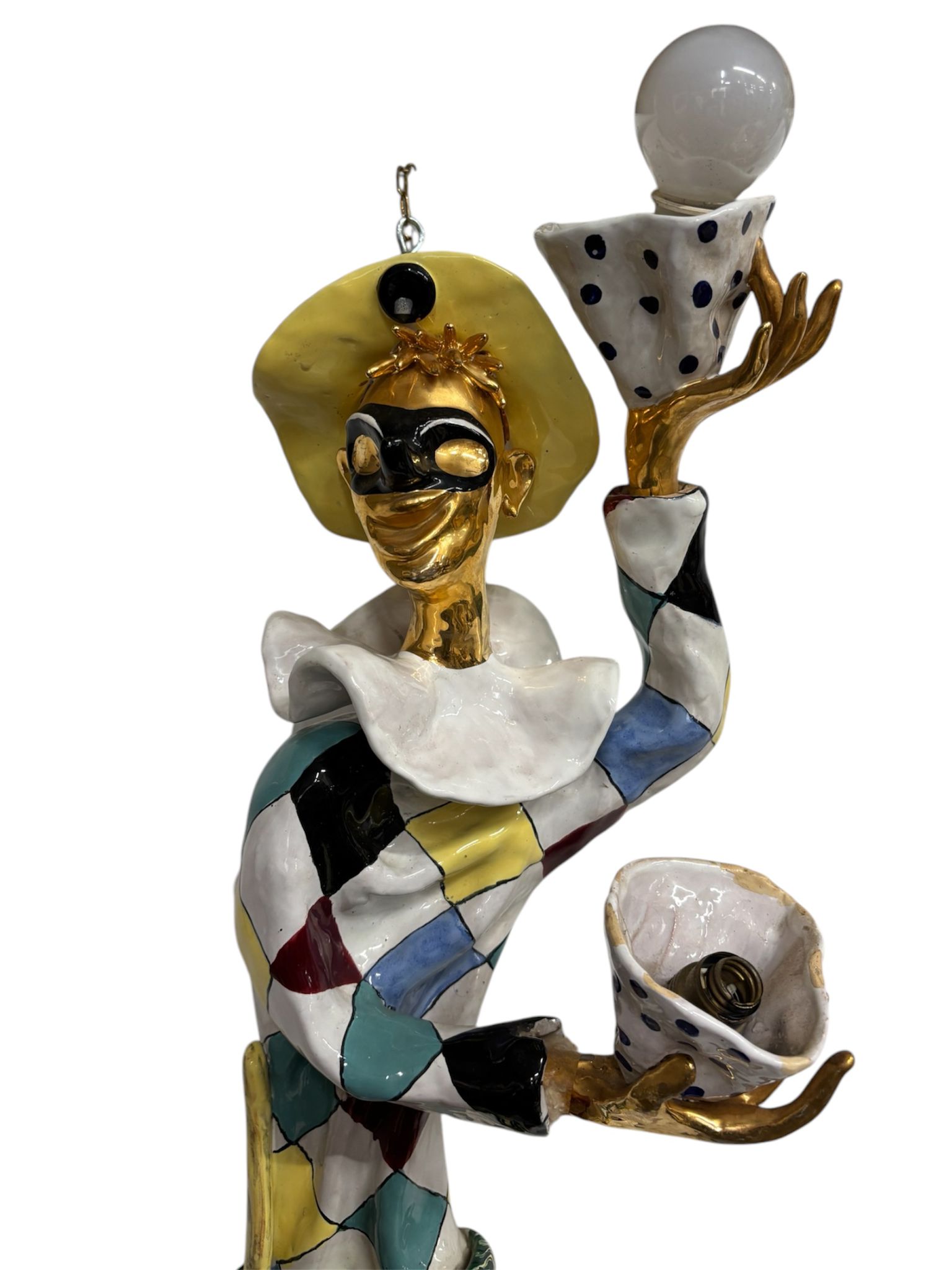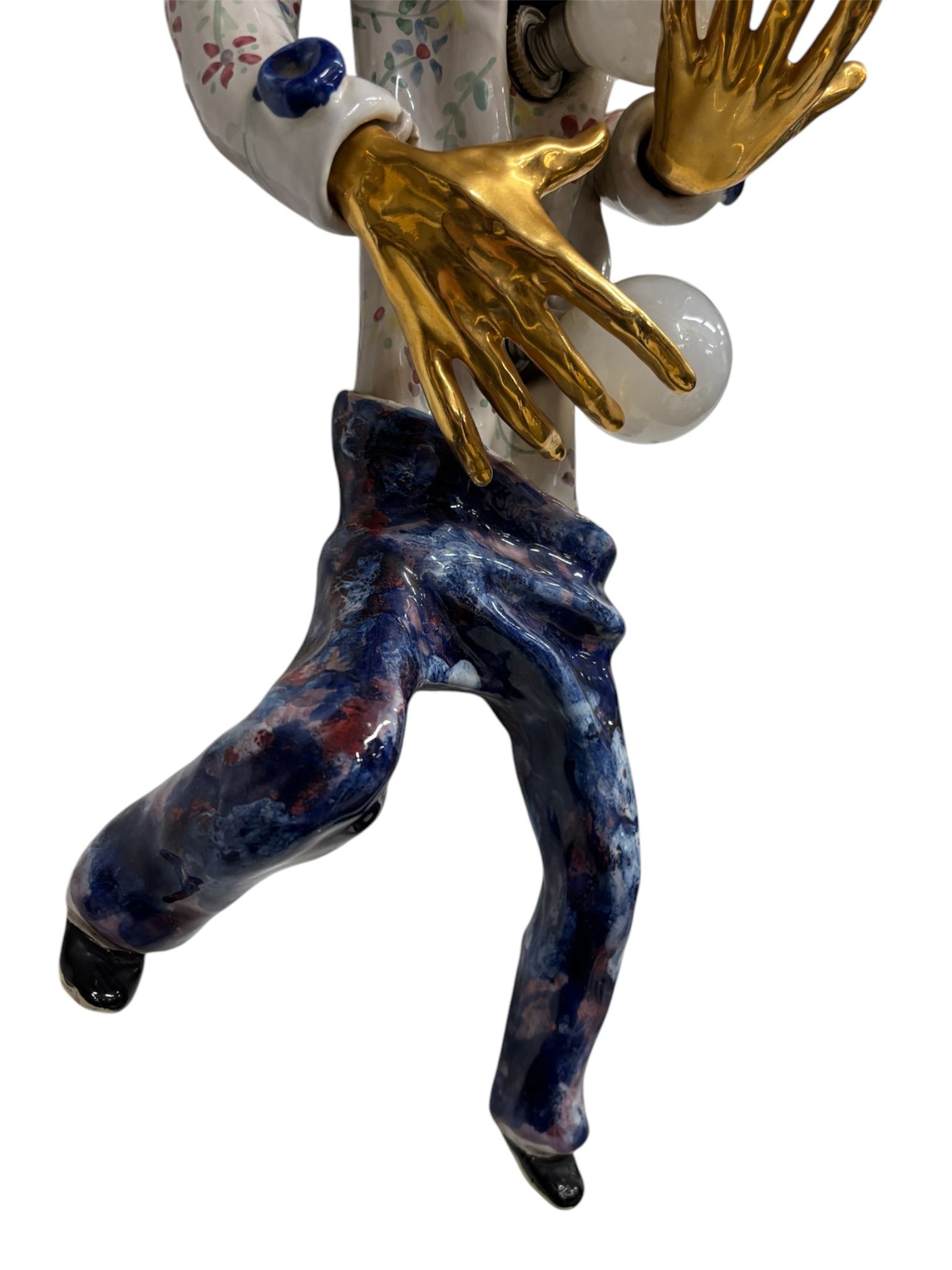 Rara coppia di aplique a due luci in ceramica policroma, raffiguranti arlecchino , firmate nel retro O. Rosa San Paolo Venezia Italy