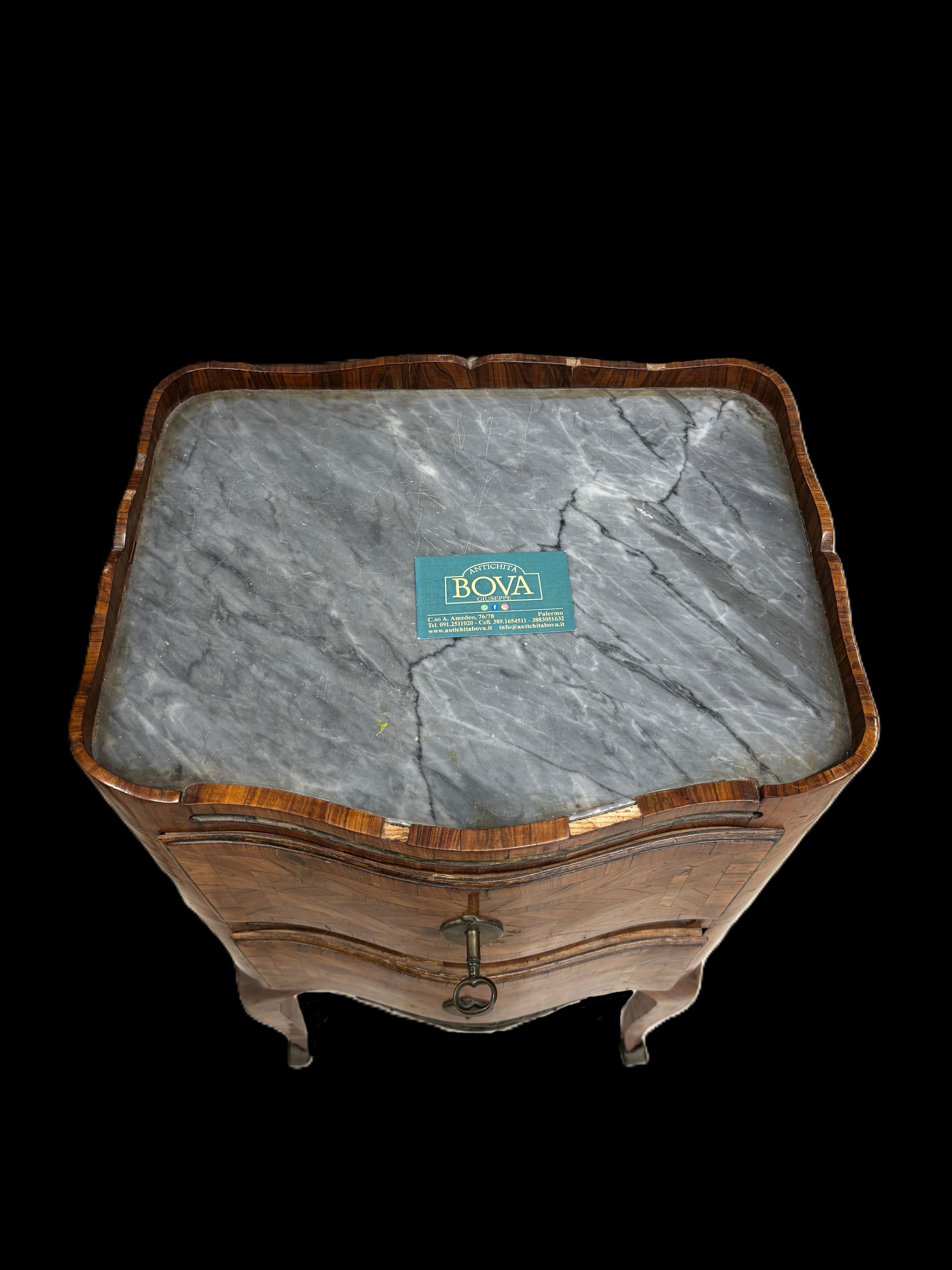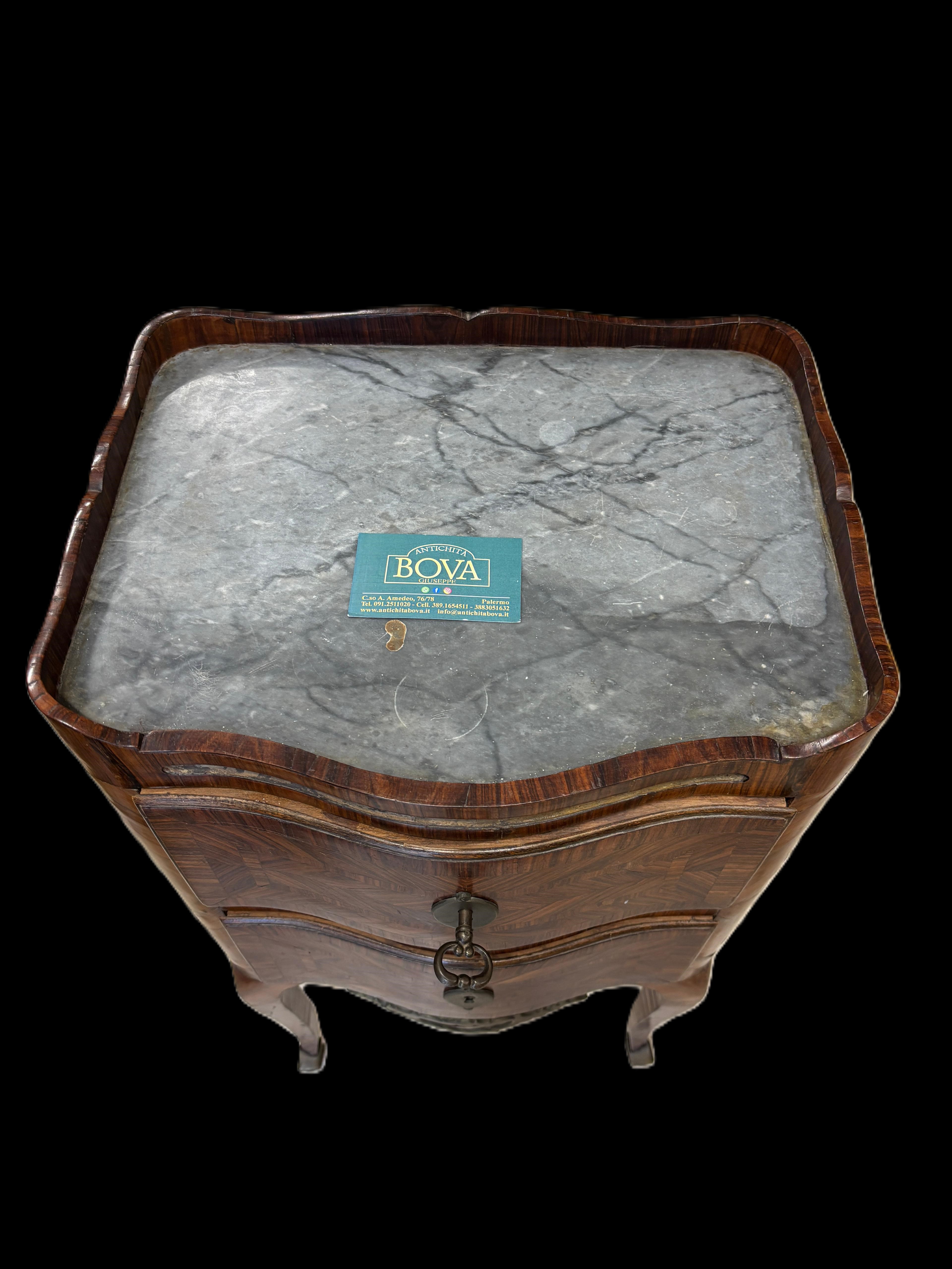 Coppia di comodini da centro stile luigi XV,  lastronati in ebano viola a in tutti e 4 lati,  con piano in marmo grigio, Sicilia prima metà del XIX secolo