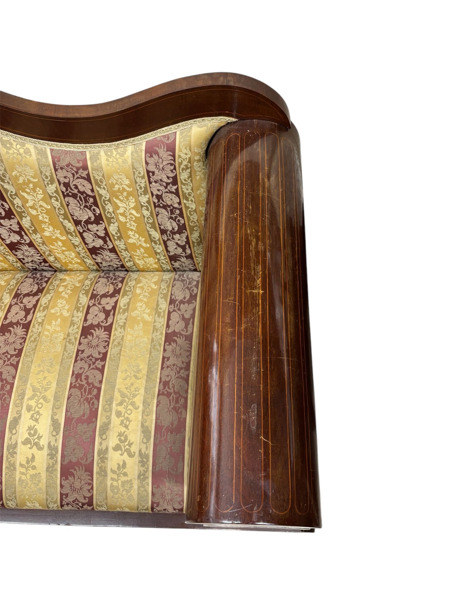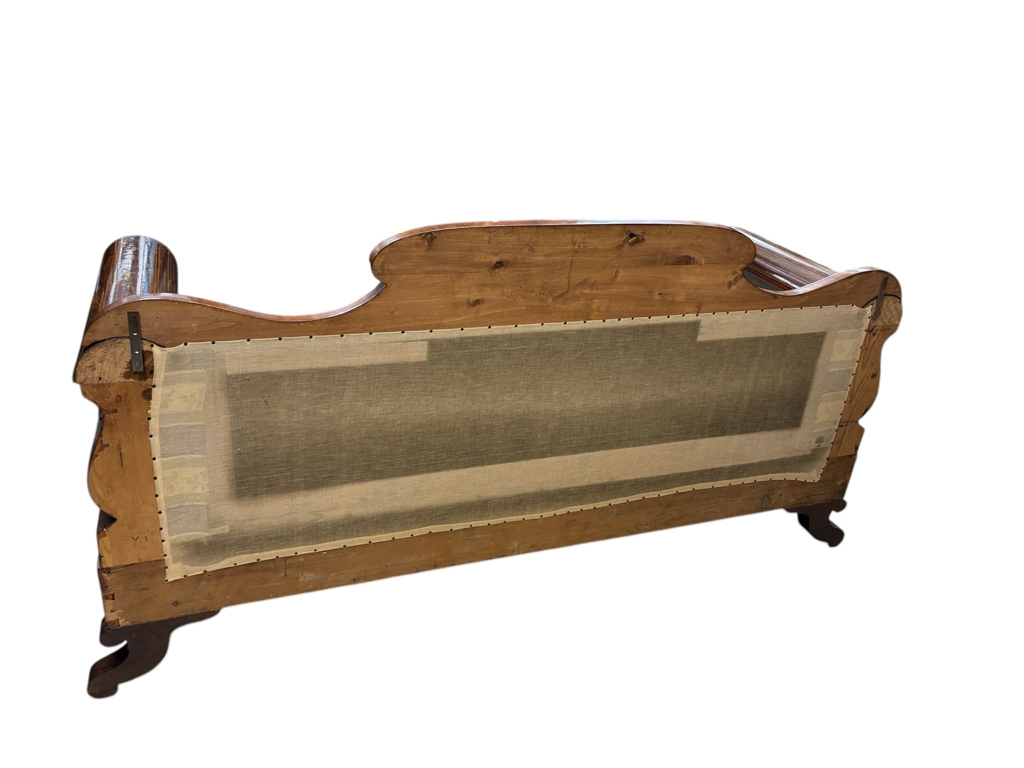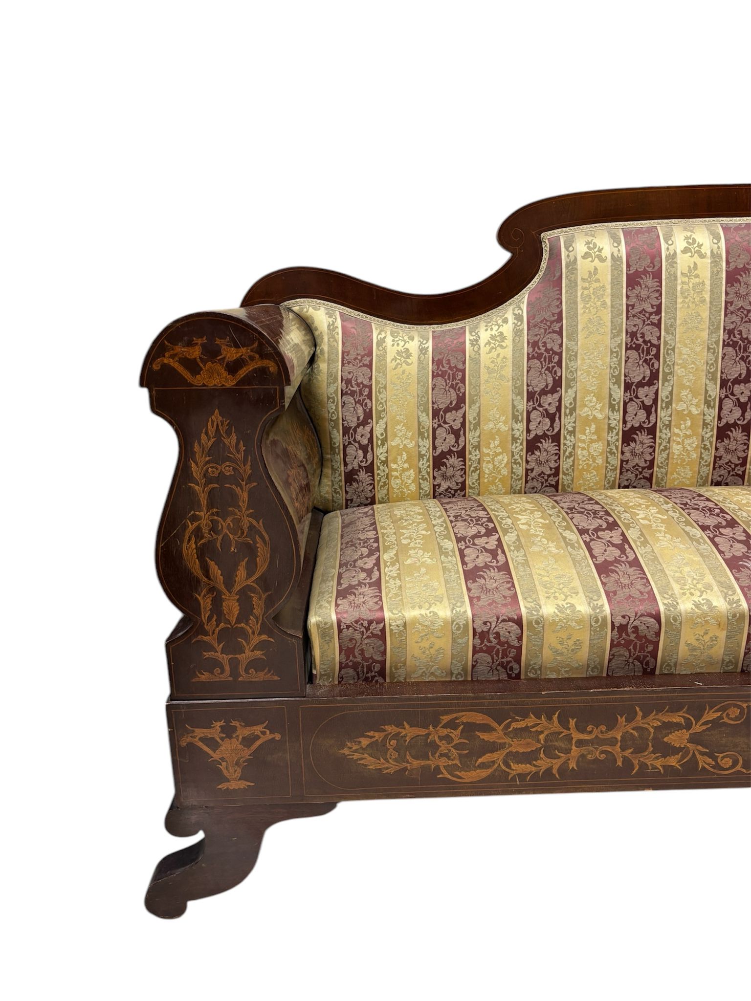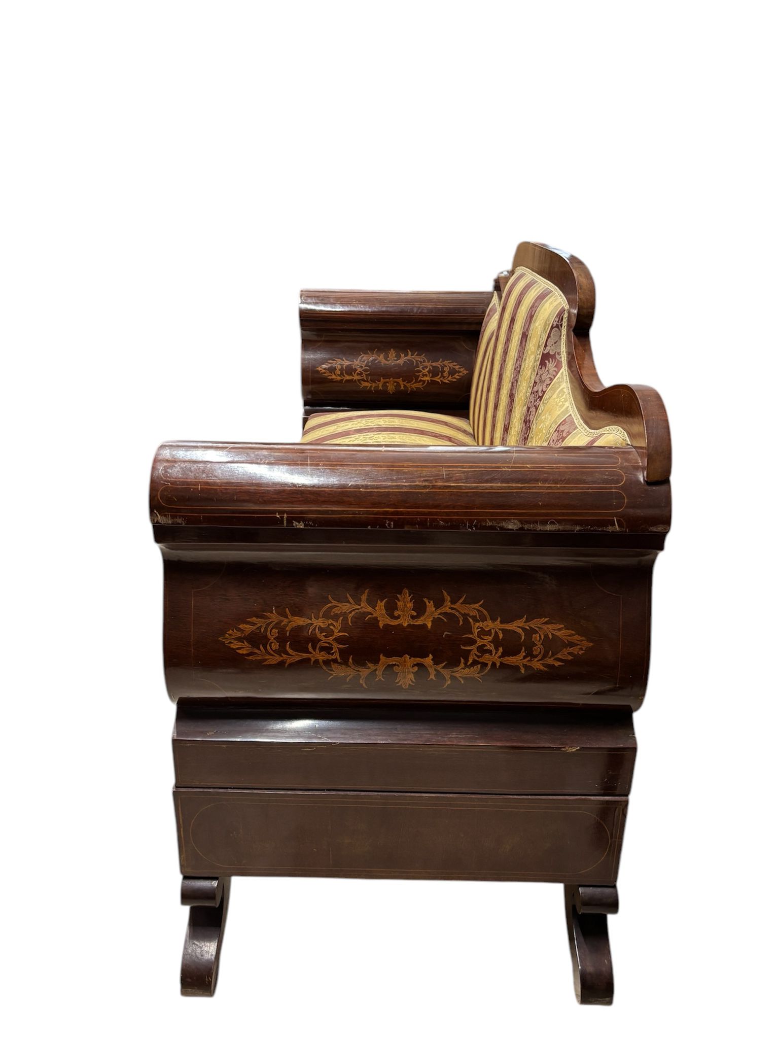 Antico divano Stile Carlo X  impiallacciato in piuma di mogano e riccamente intarsiato in legno di bosso a motivo ornamentale.