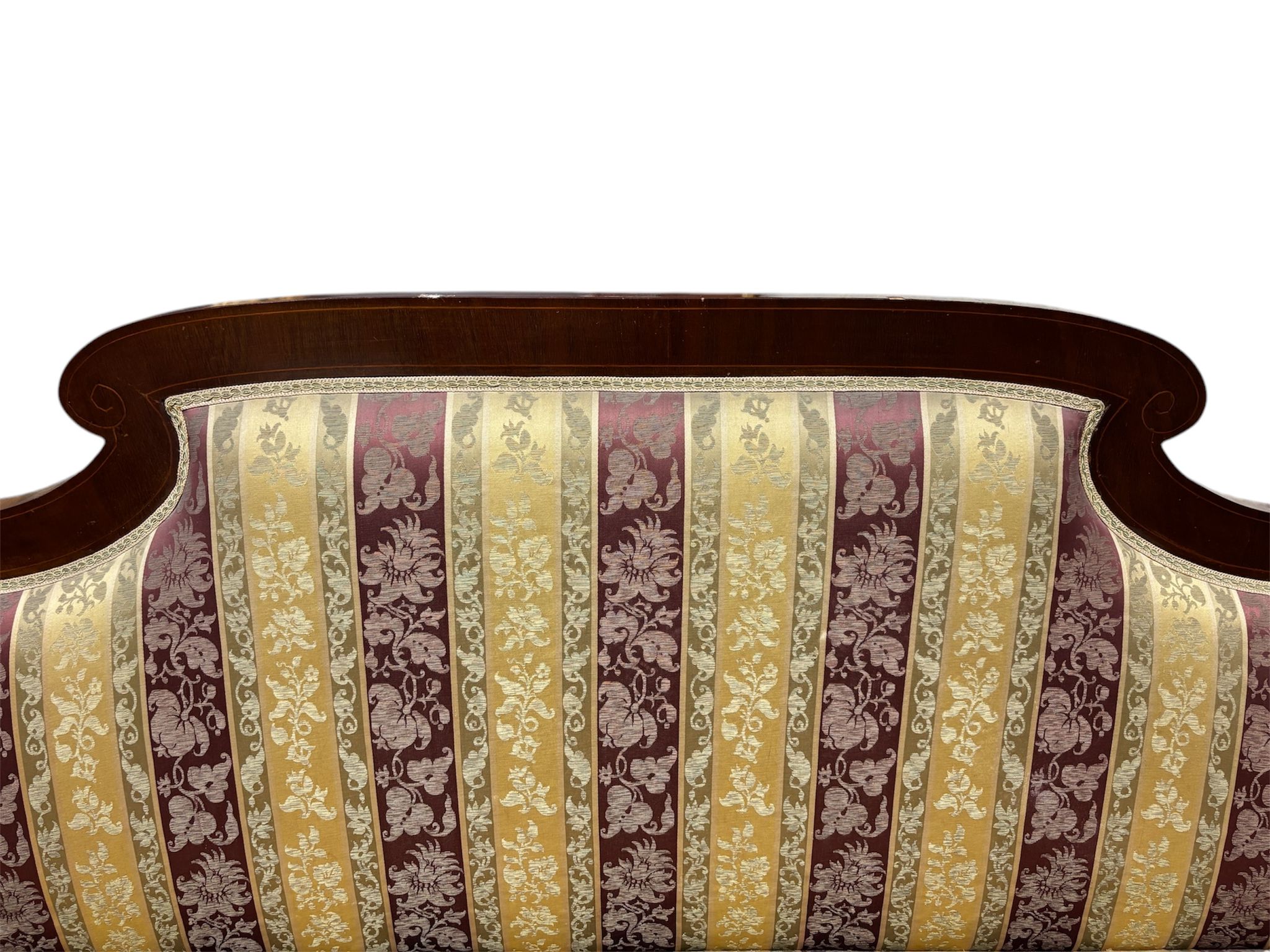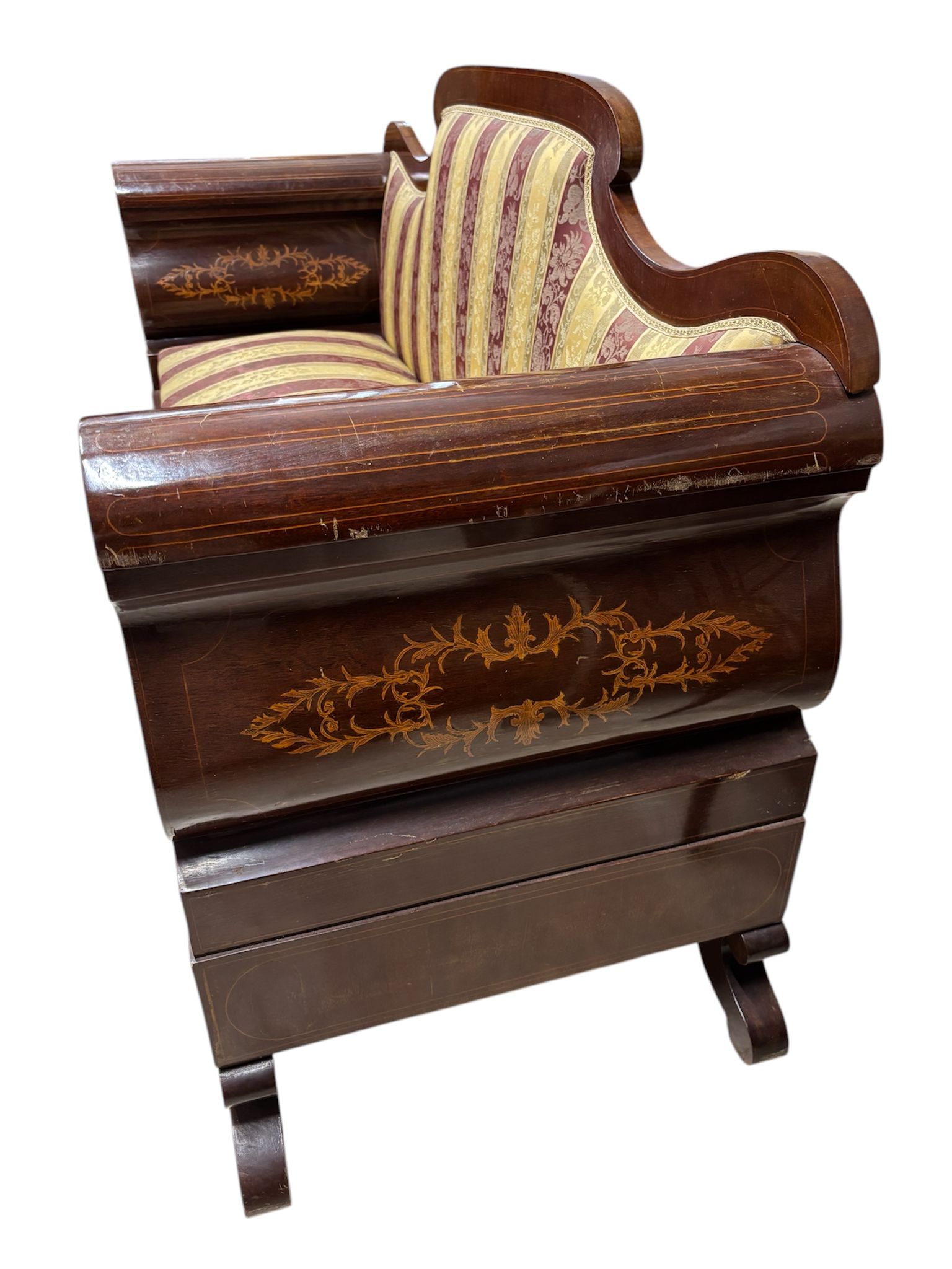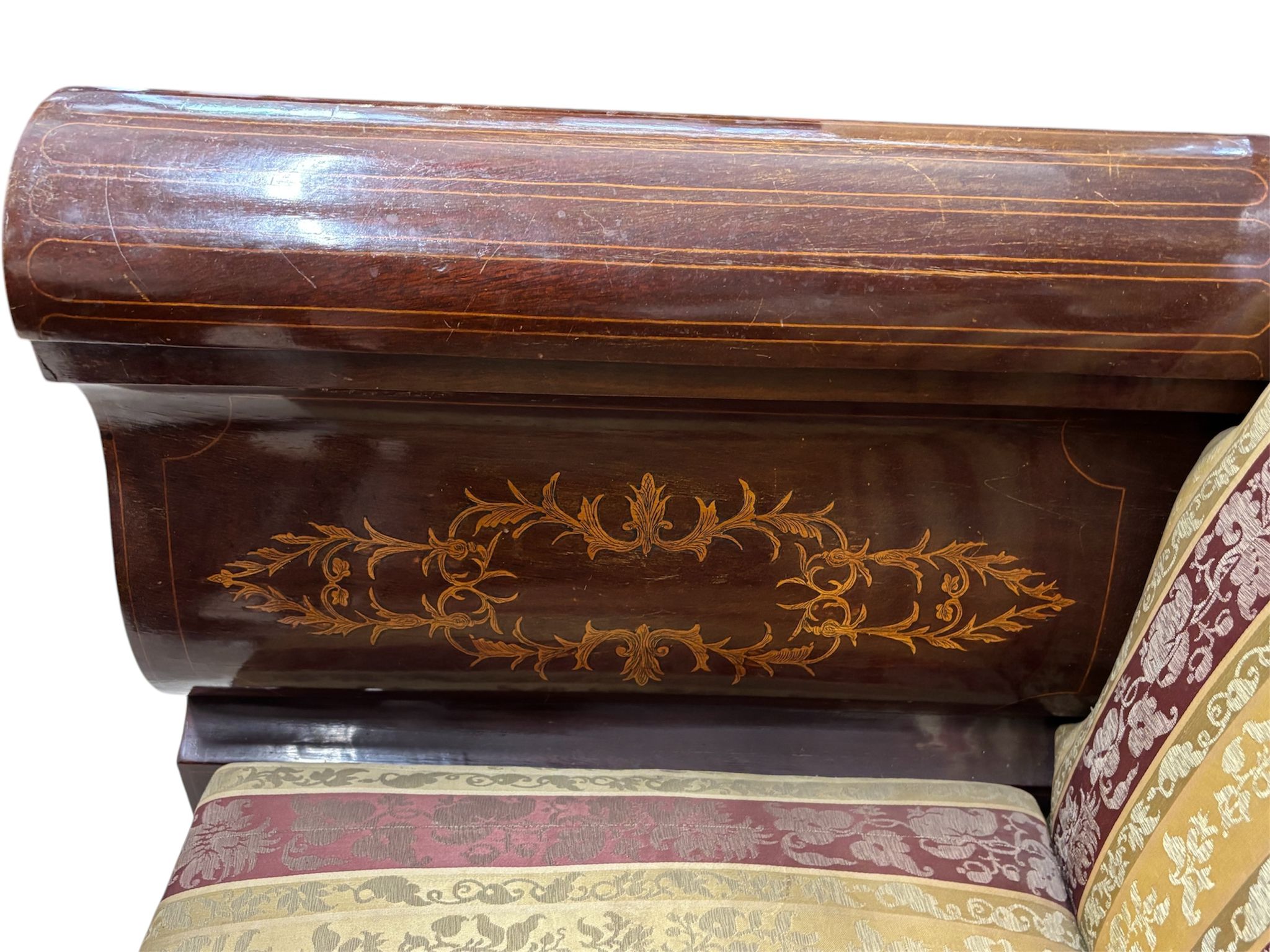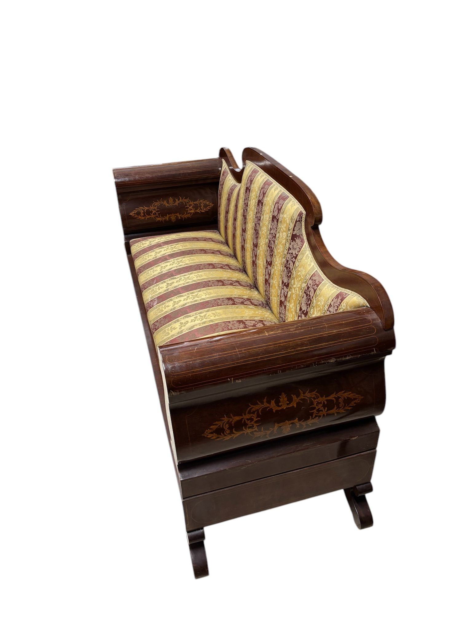 Antico divano Stile Carlo X  impiallacciato in piuma di mogano e riccamente intarsiato in legno di bosso a motivo ornamentale.