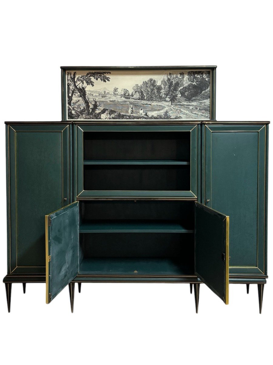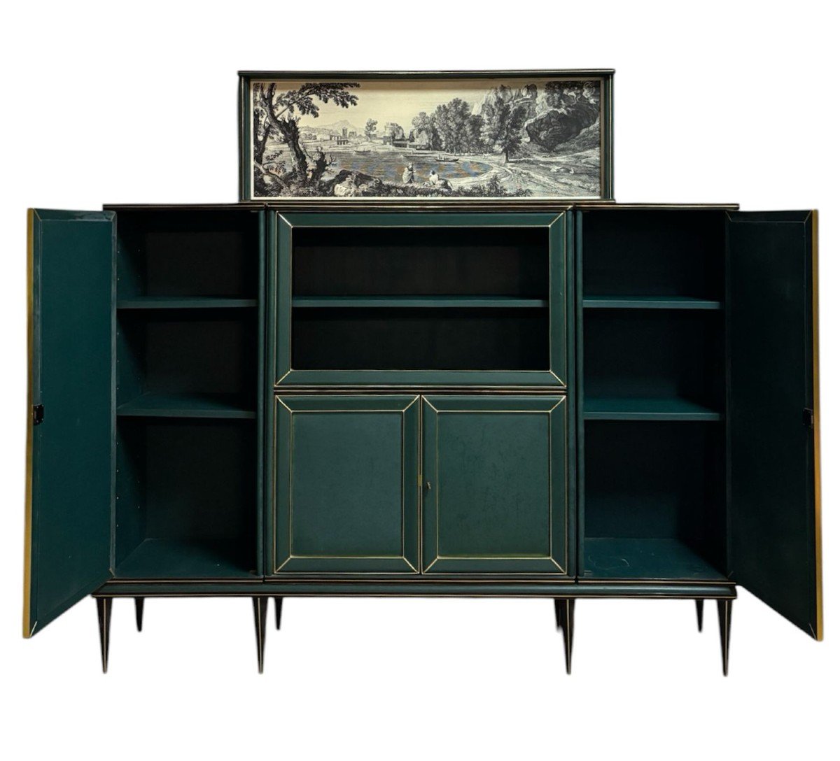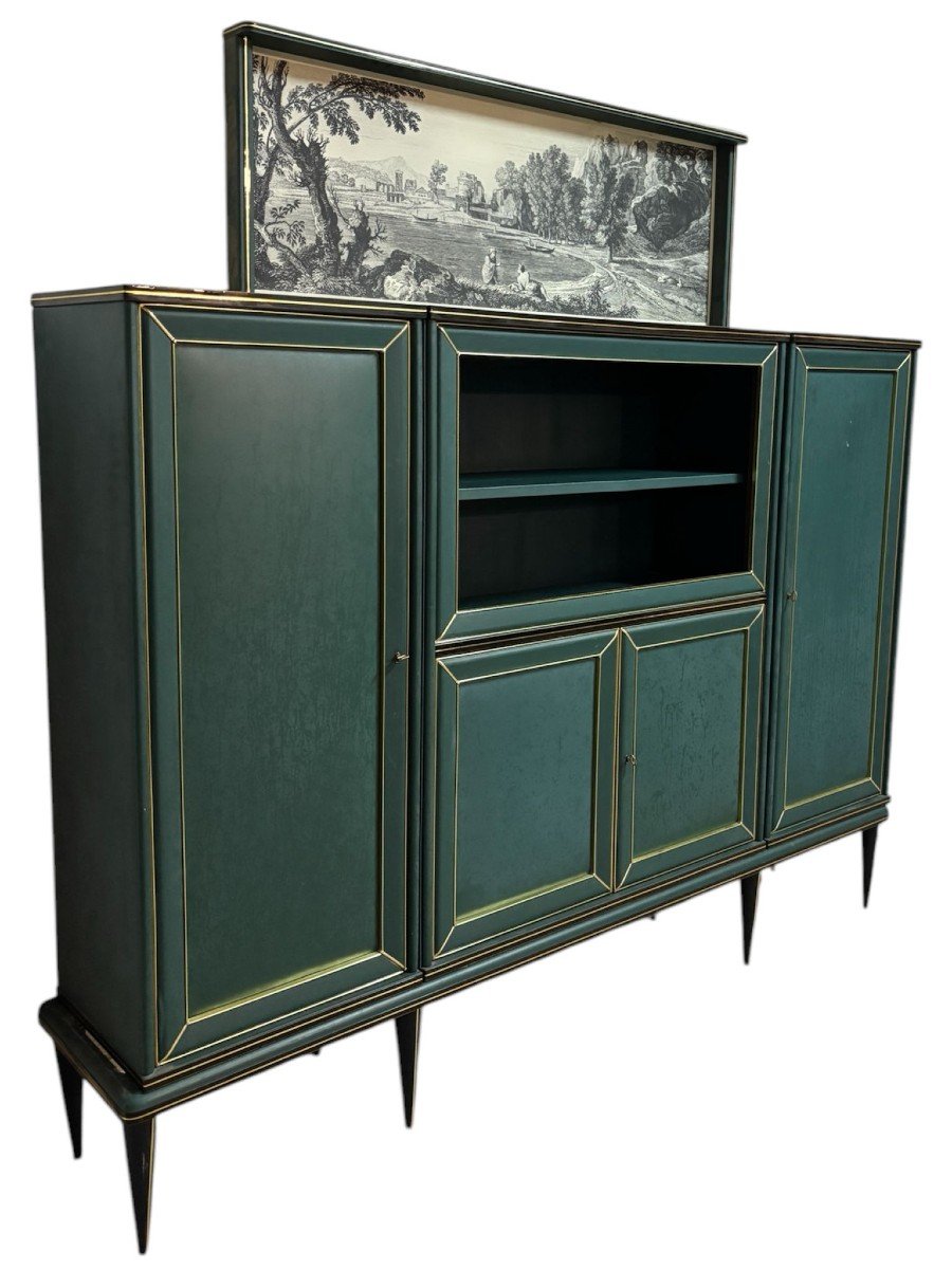 Importante mobile da ufficio di Umberto Mascagni con ante e scaffalature, in alto presenta una stampa in bianco e nero con paesaggio marino barche e personaggi.