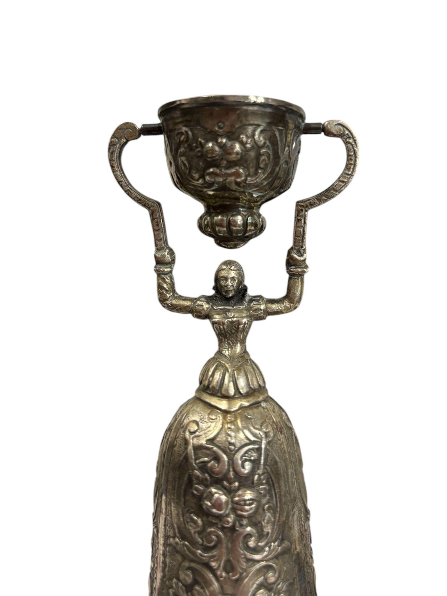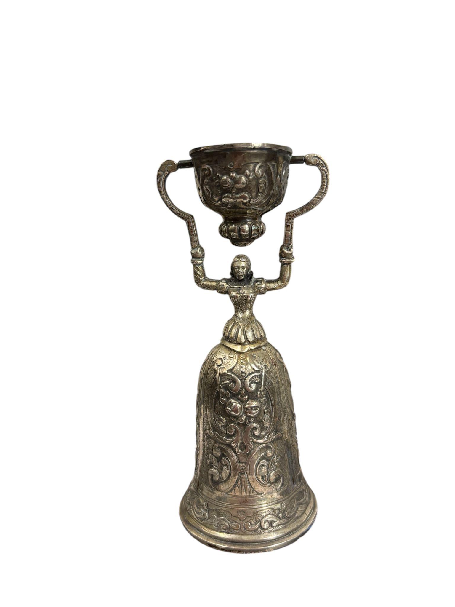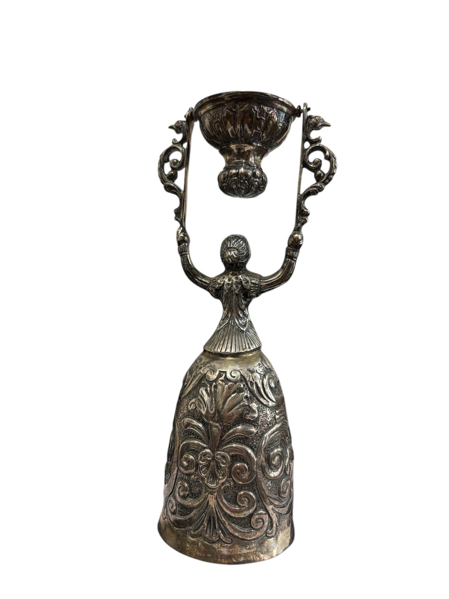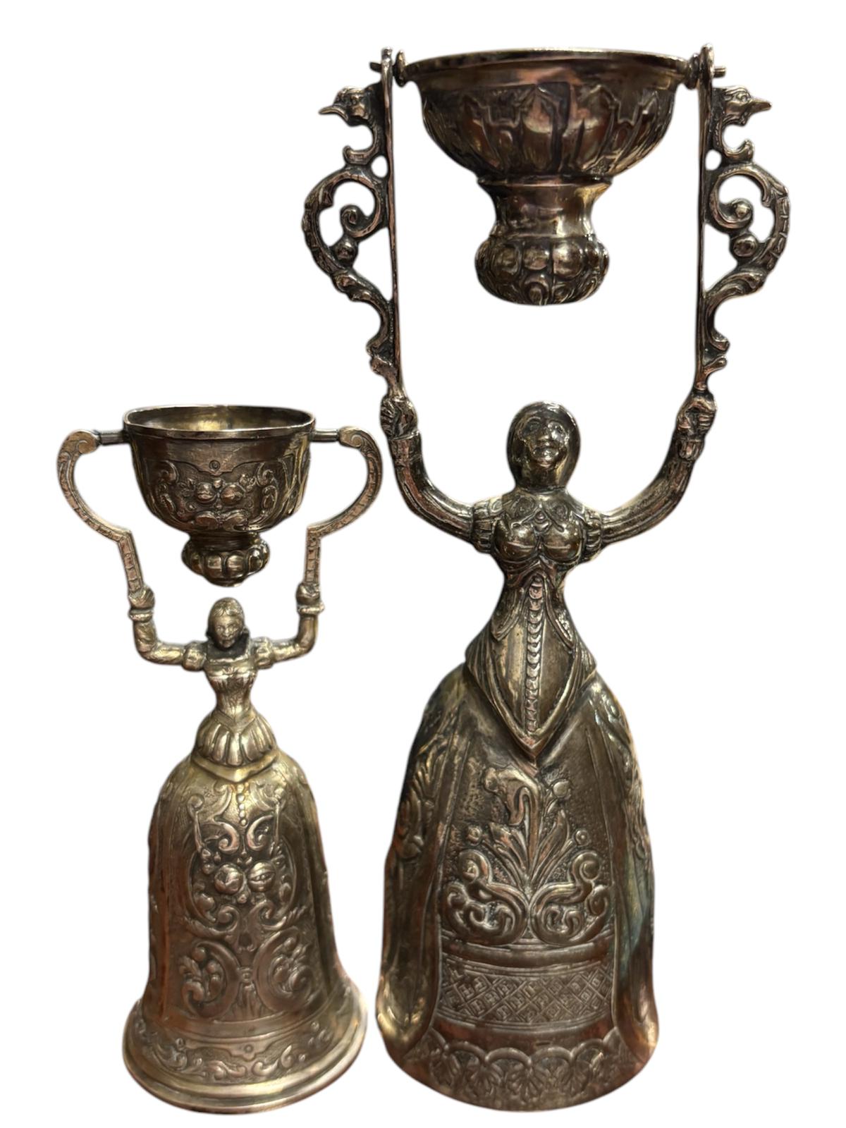 Due coppe dell’amore in argento manifattura tedesca, XIX – XX Sec.corpi sbalzati e cesellati con motivi floreali e volute vegetali. Dimensioni: 16.5 x 5.5 cm 11.5 x 4.5 cm