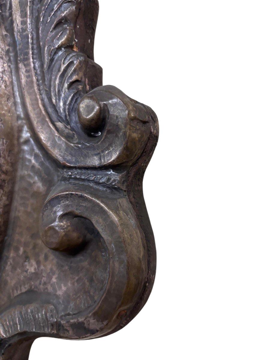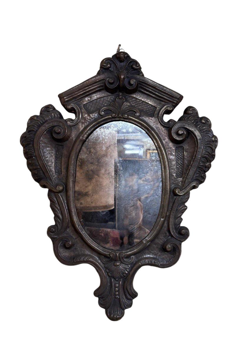 Antica e rara cornice italiana insolita per via delle dimensioni fuori dalla norma (cm.56; h.78). Di forma barocca, realizzata in Italia nei primi dell’800 in lamina di metallo con spesso strato d’argentatura. Decorata a mano con lavorazione a sbalzo con ampie volute in rilievo, realizzate per mezzo di martellature effettuate dal retro Dimensioni della luce ovale: cm.25; h.36 Si presenta in ottimo stato di conservazione.