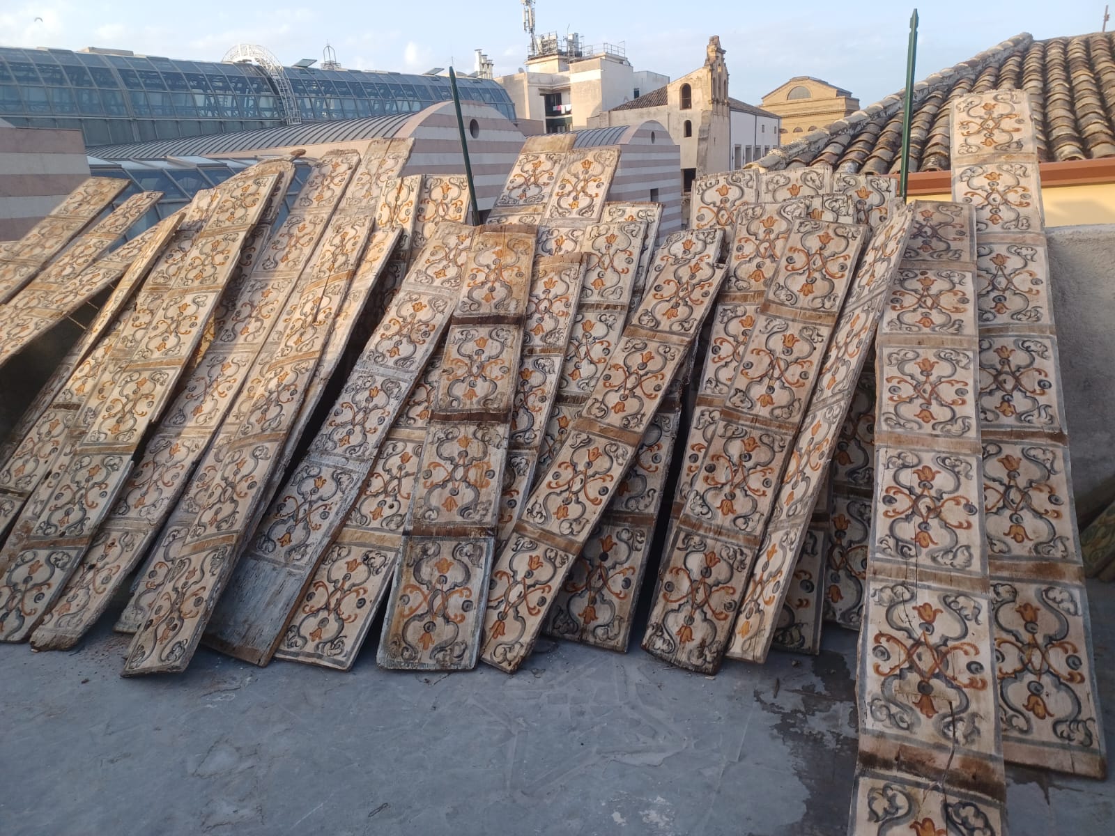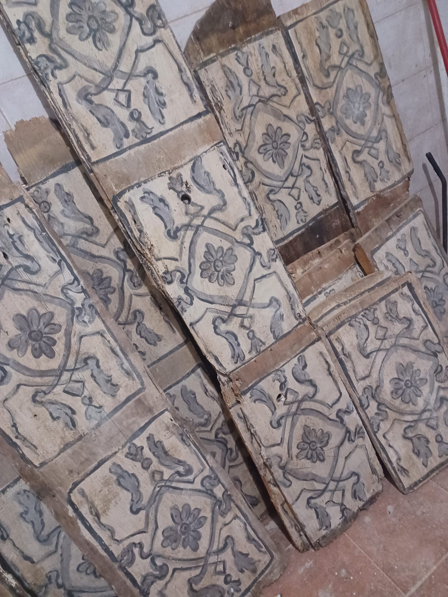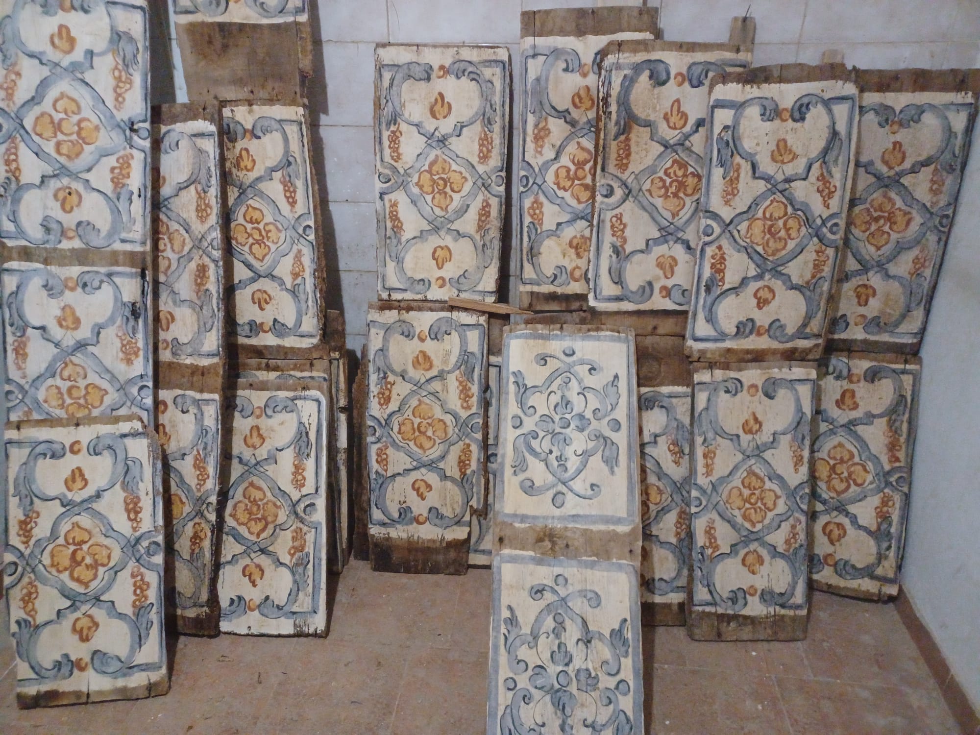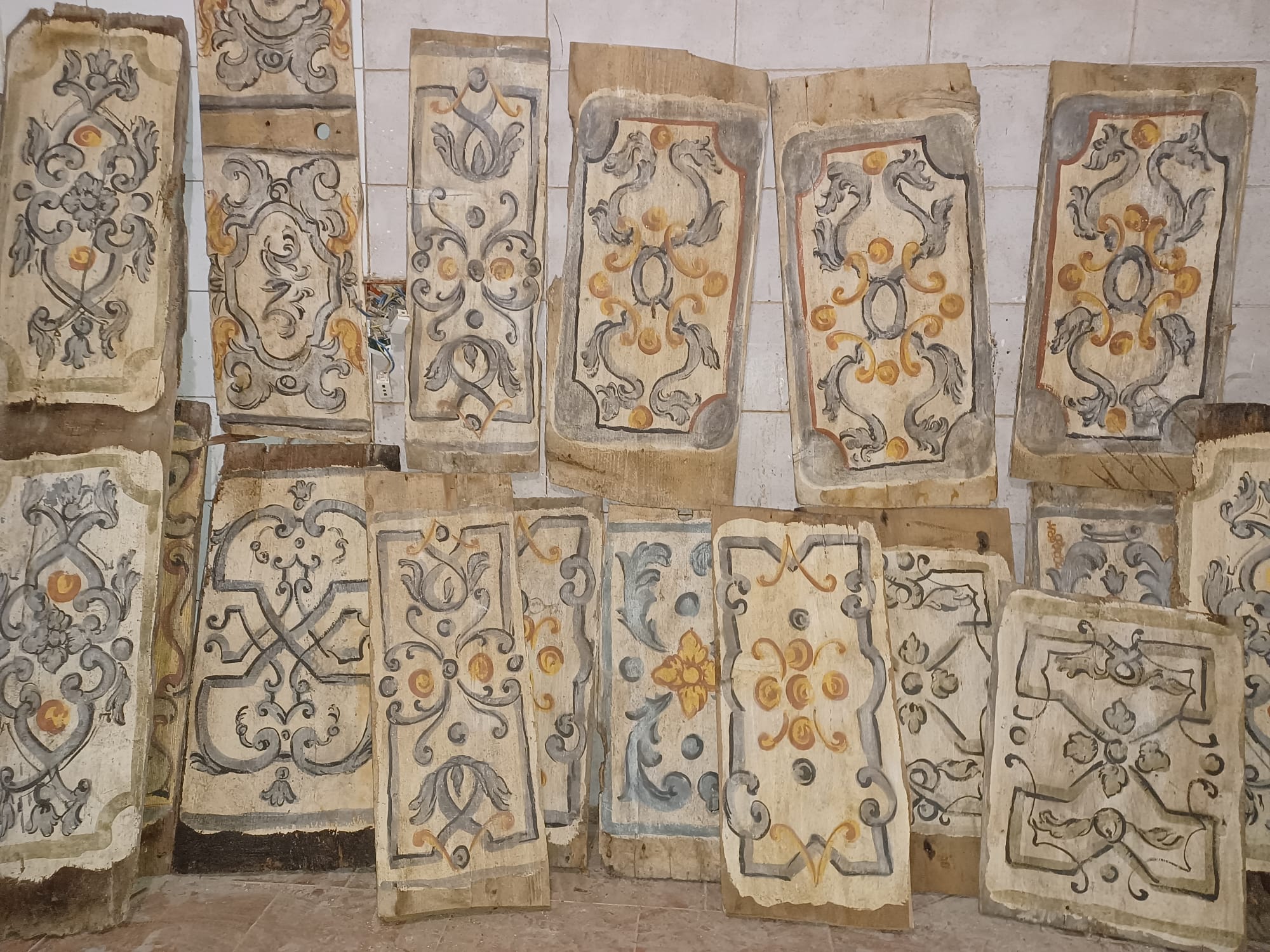 Antiche tavole da soffitto dipinte su legno, XVIII sec. Disponibili in varie misure, da 1,5 m a 3 m, fino ad un metratura di 95 mq circa.