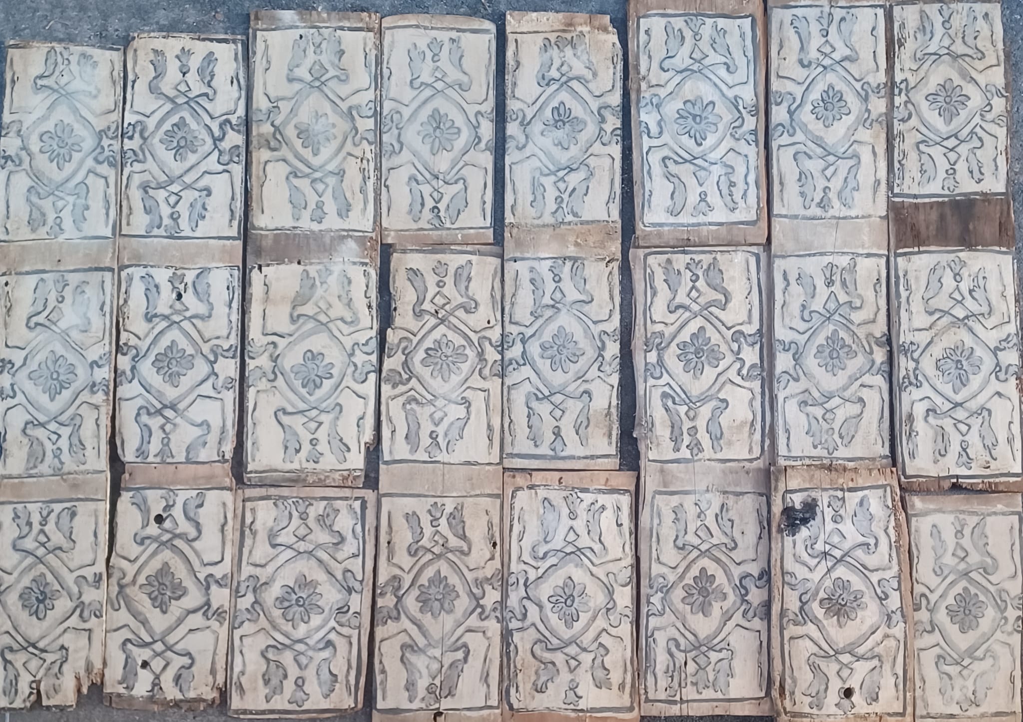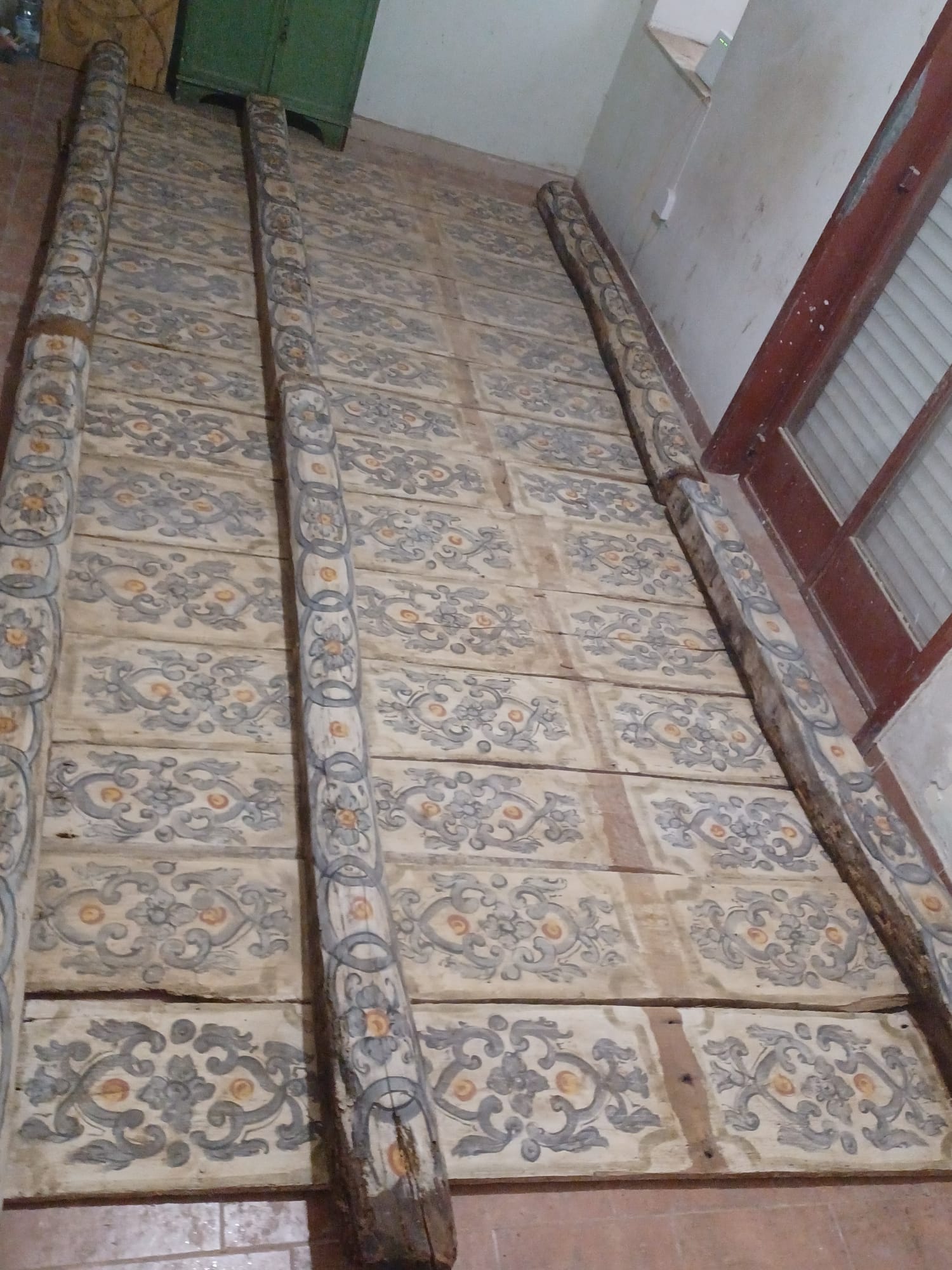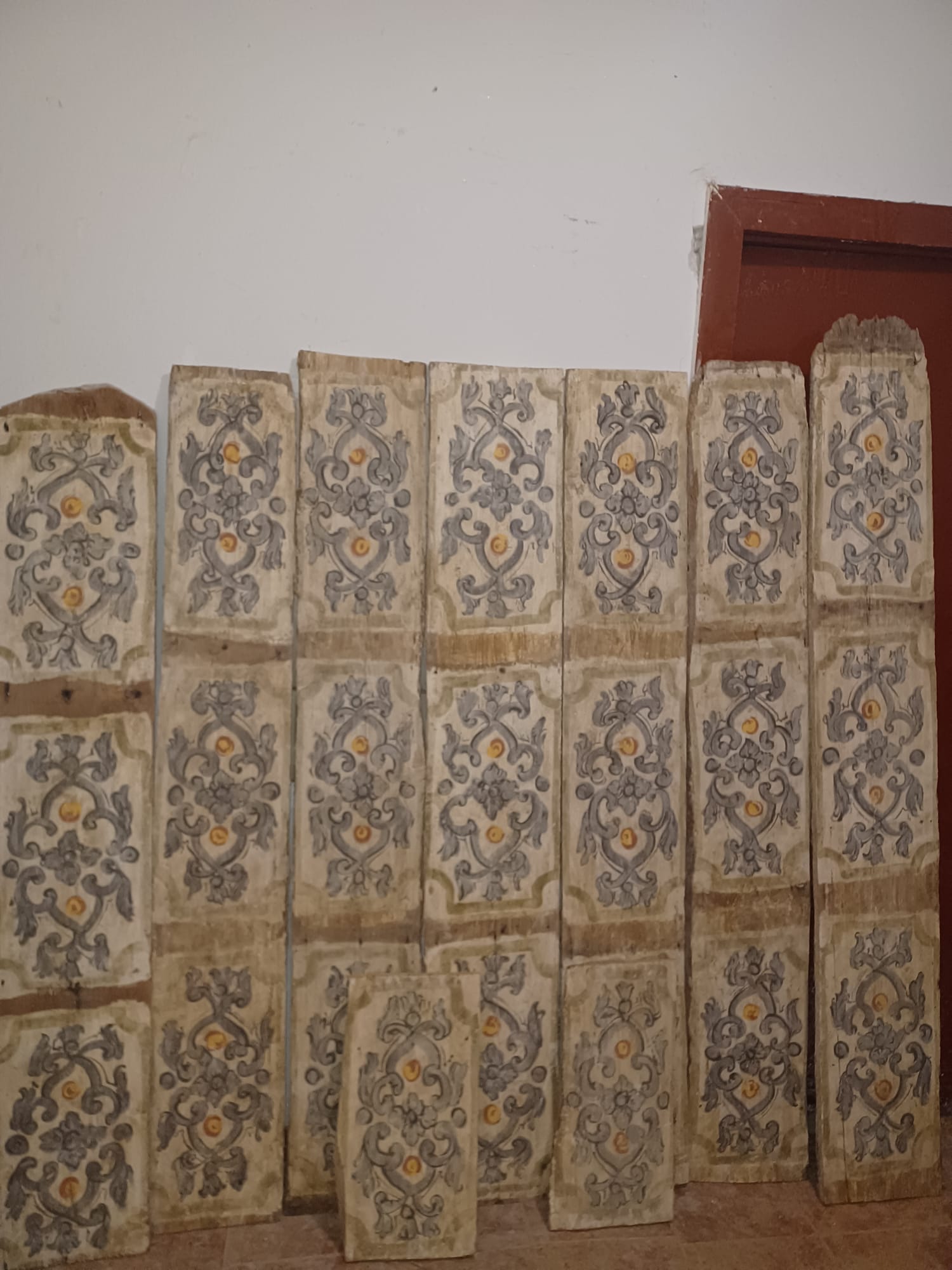 Antiche tavole da soffitto dipinte su legno, XVIII sec. Disponibili in varie misure, da 1,5 m a 3 m, fino ad un metratura di 95 mq circa.
