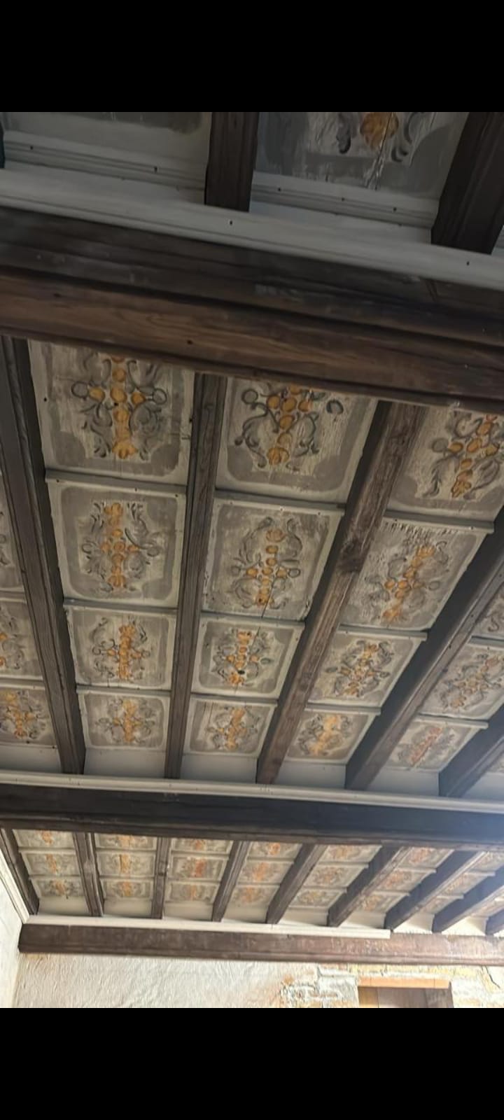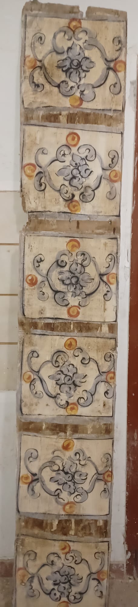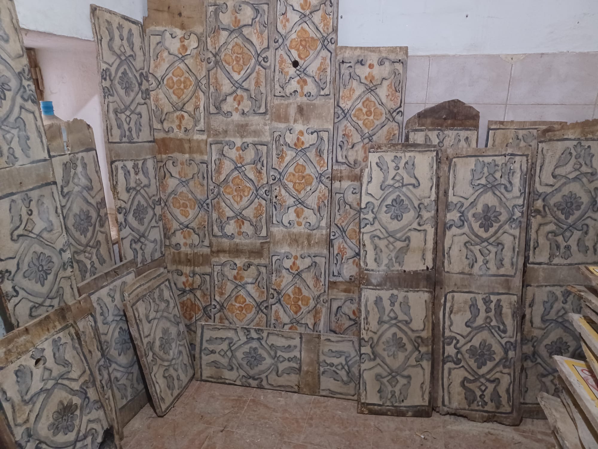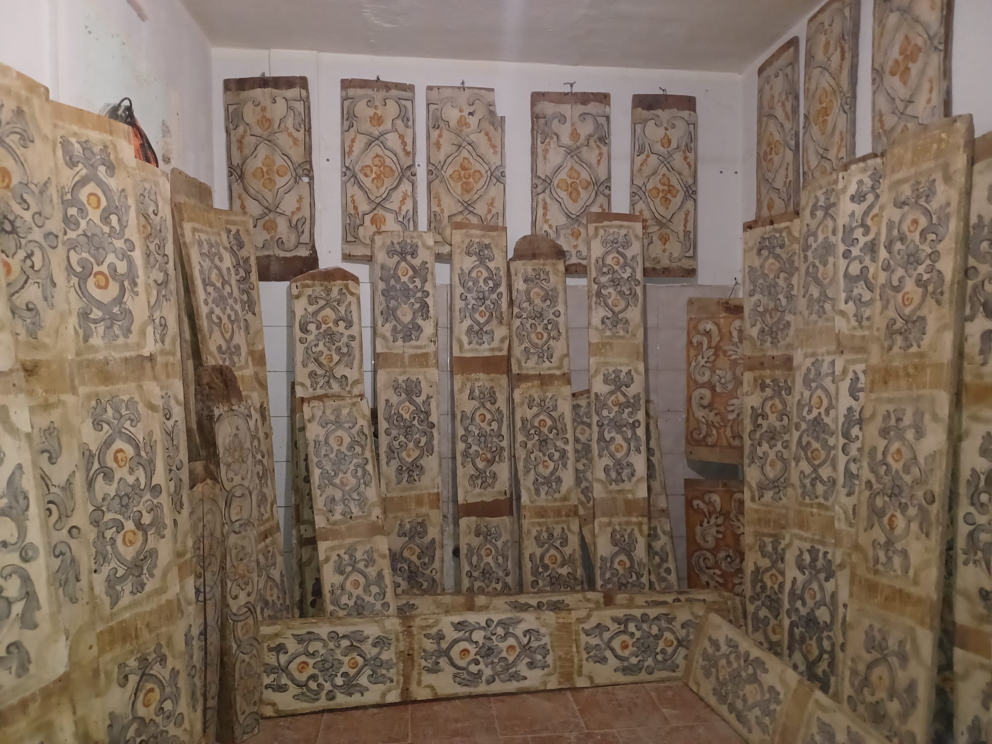 Antiche tavole da soffitto dipinte su legno, XVIII sec. Disponibili in varie misure, da 1,5 m a 3 m, fino ad un metratura di 95 mq circa.