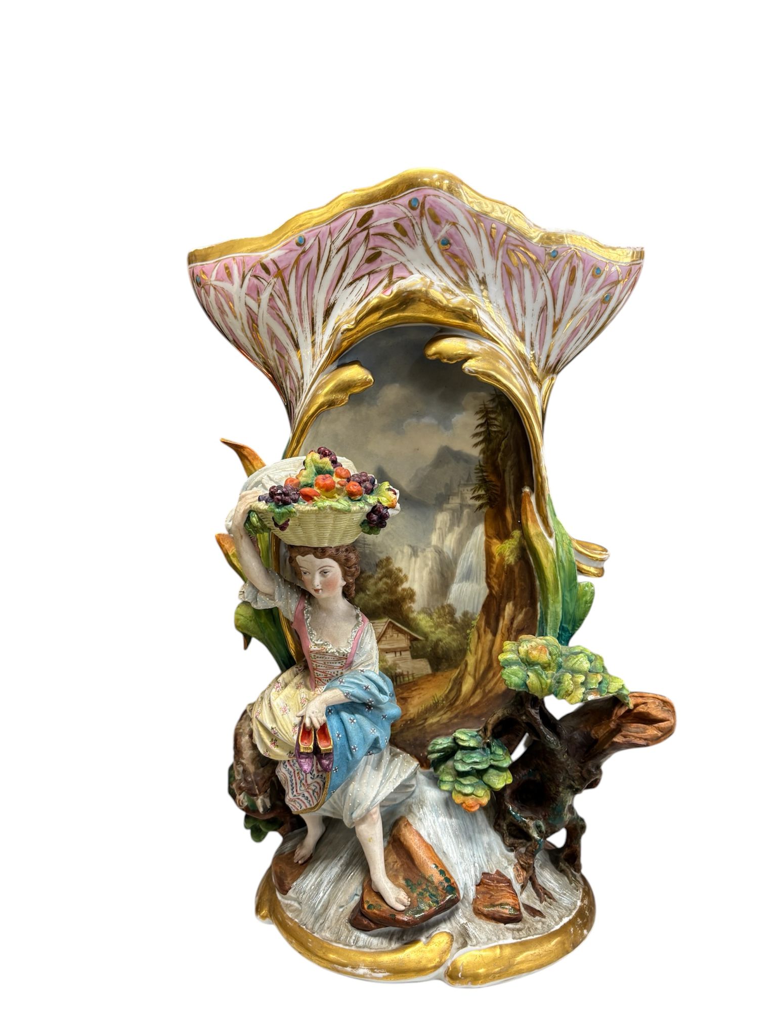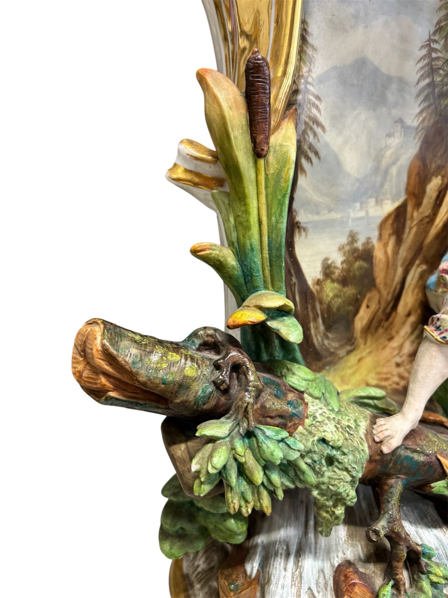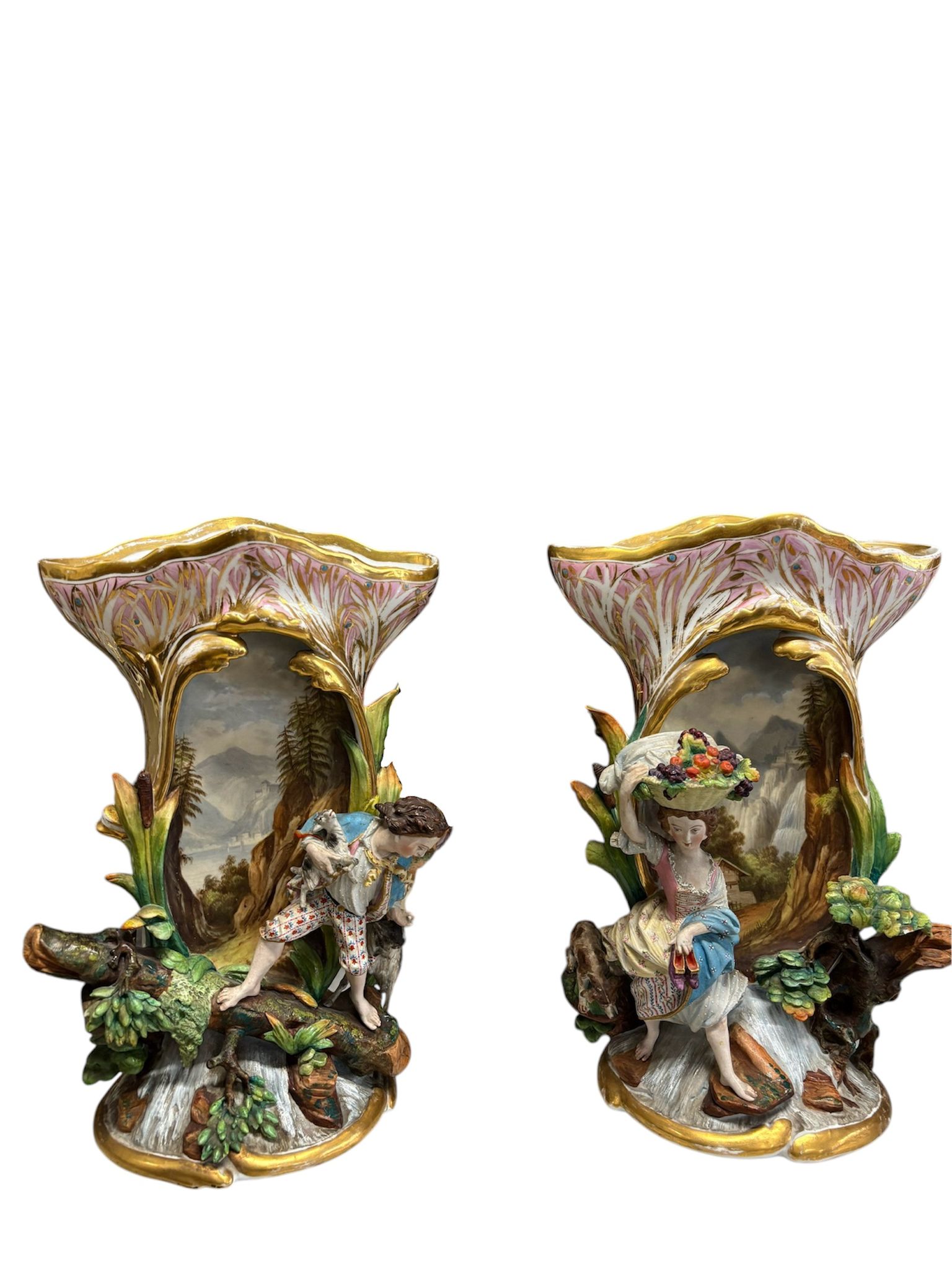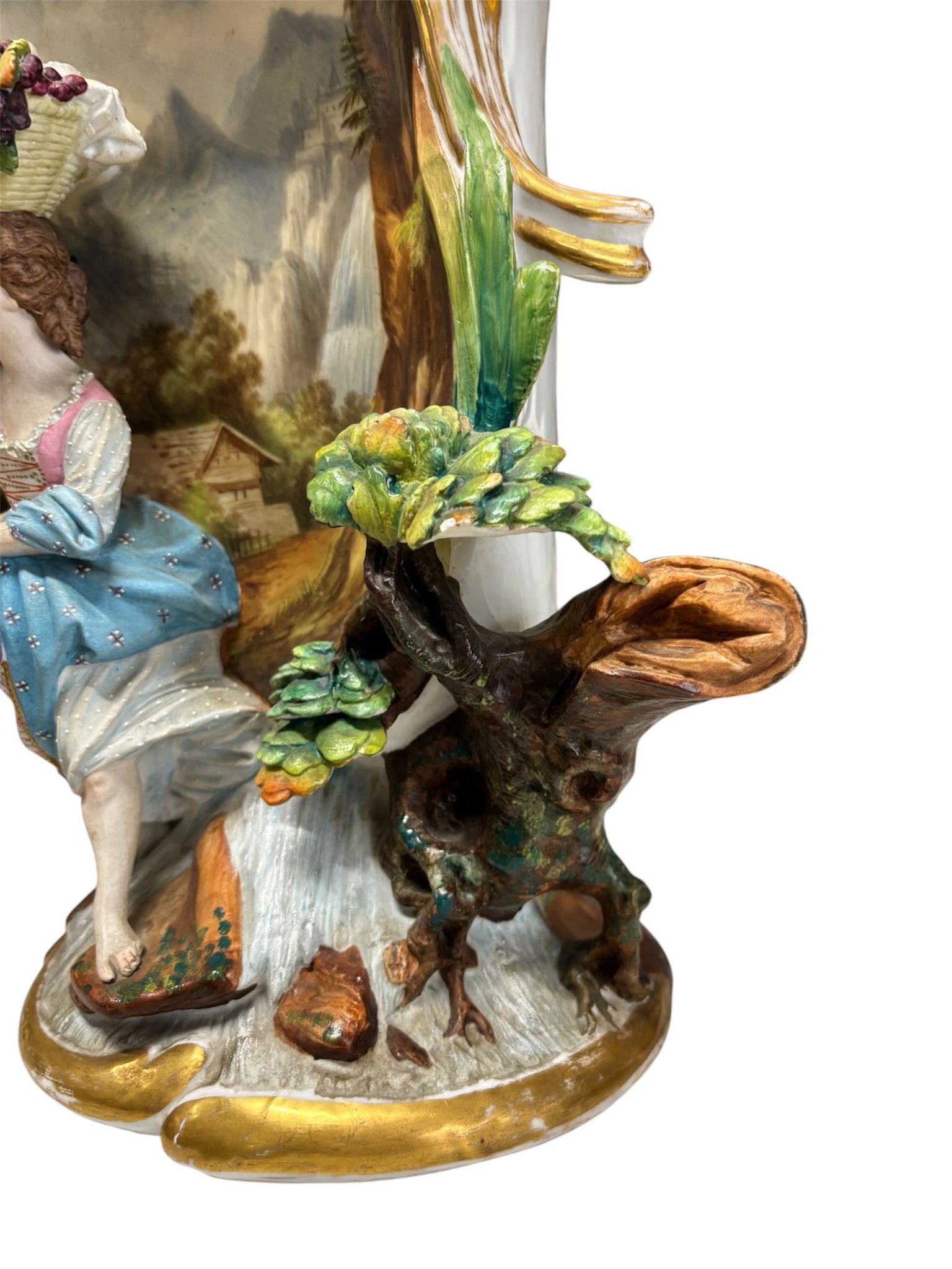 Coppia di grandi vasi in porcellana Vecchia Parigi con decorazioni fitomorfe e dorature, applicazioni in biscuit e inserto ovale con paesaggio. Francia 1830-1860