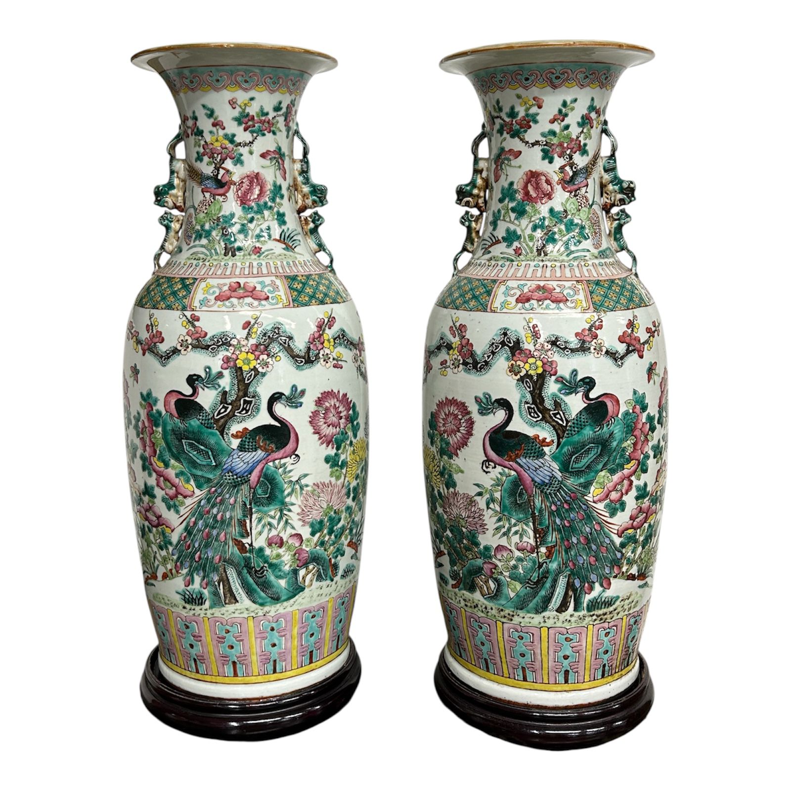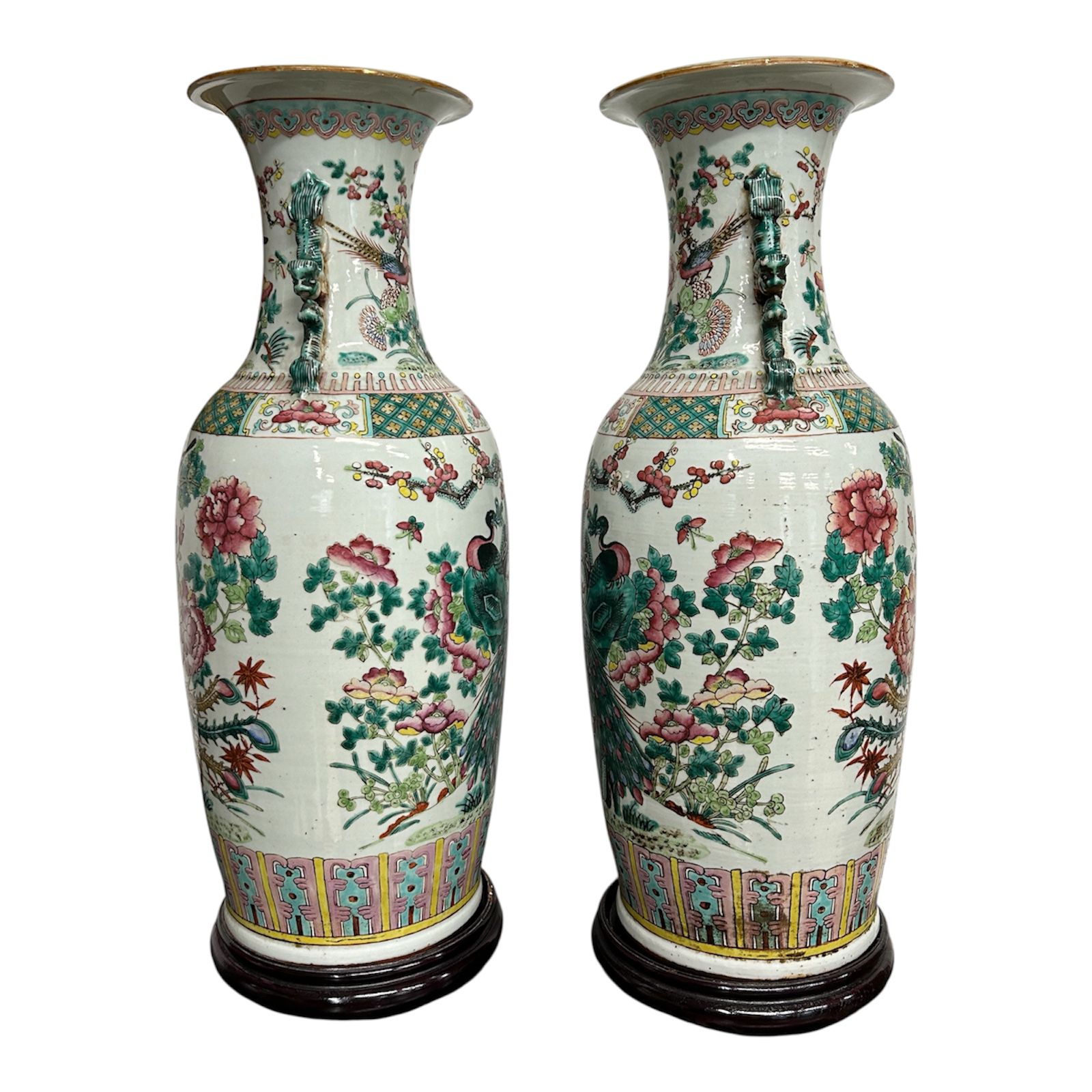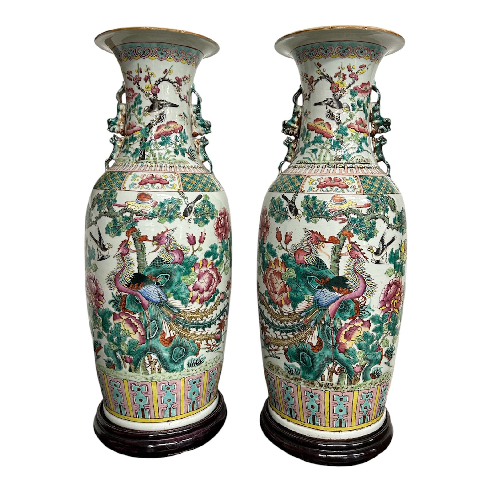 Coppia di vasi in porcellana della famiglia Rosa del XIX secolo, con decorazioni policrome a motivi orientali, faunistici e floreali. Posseggono le basi in legno coeve. Dimensioni: 23,5 cm x 61,5 cm