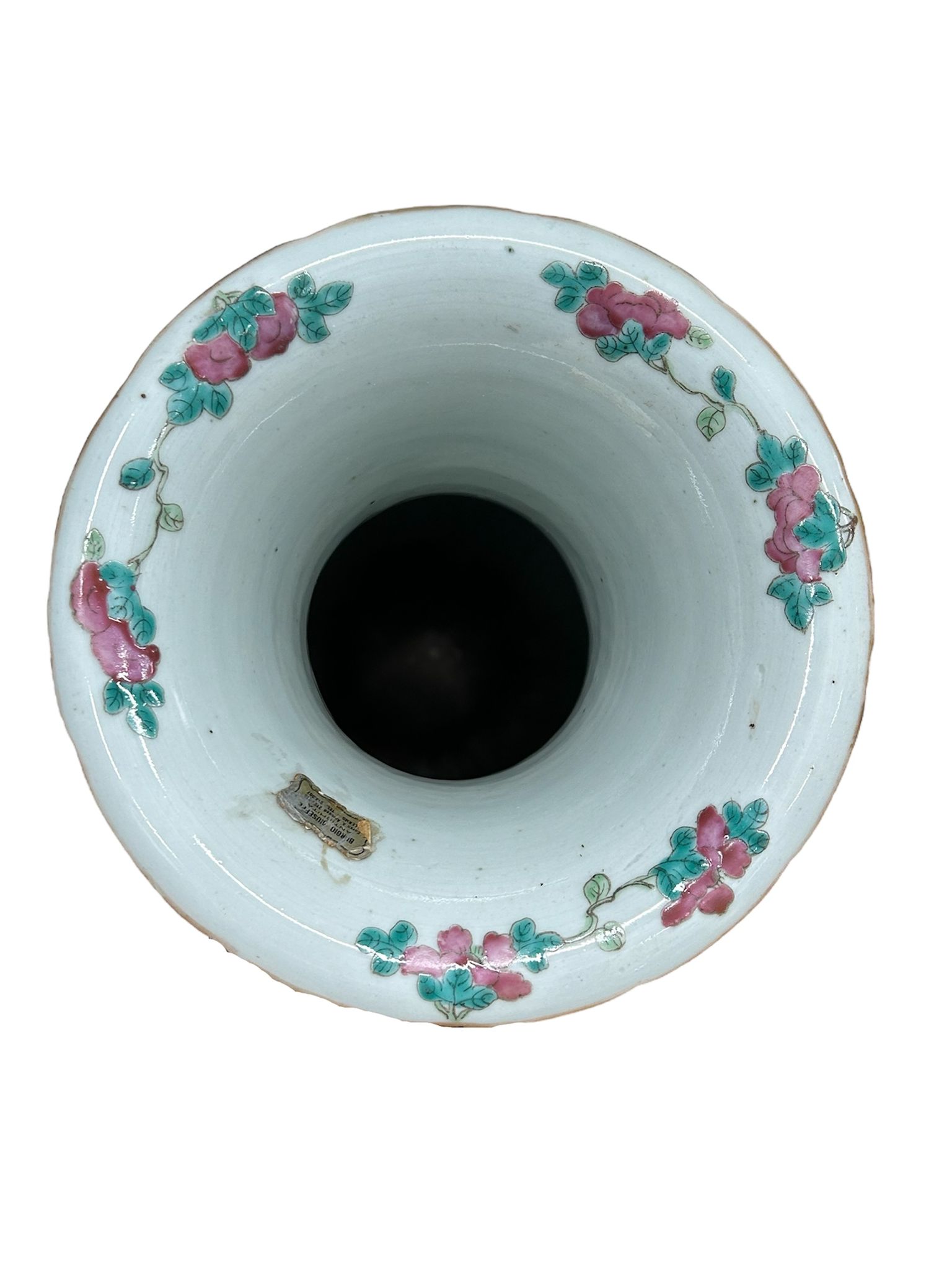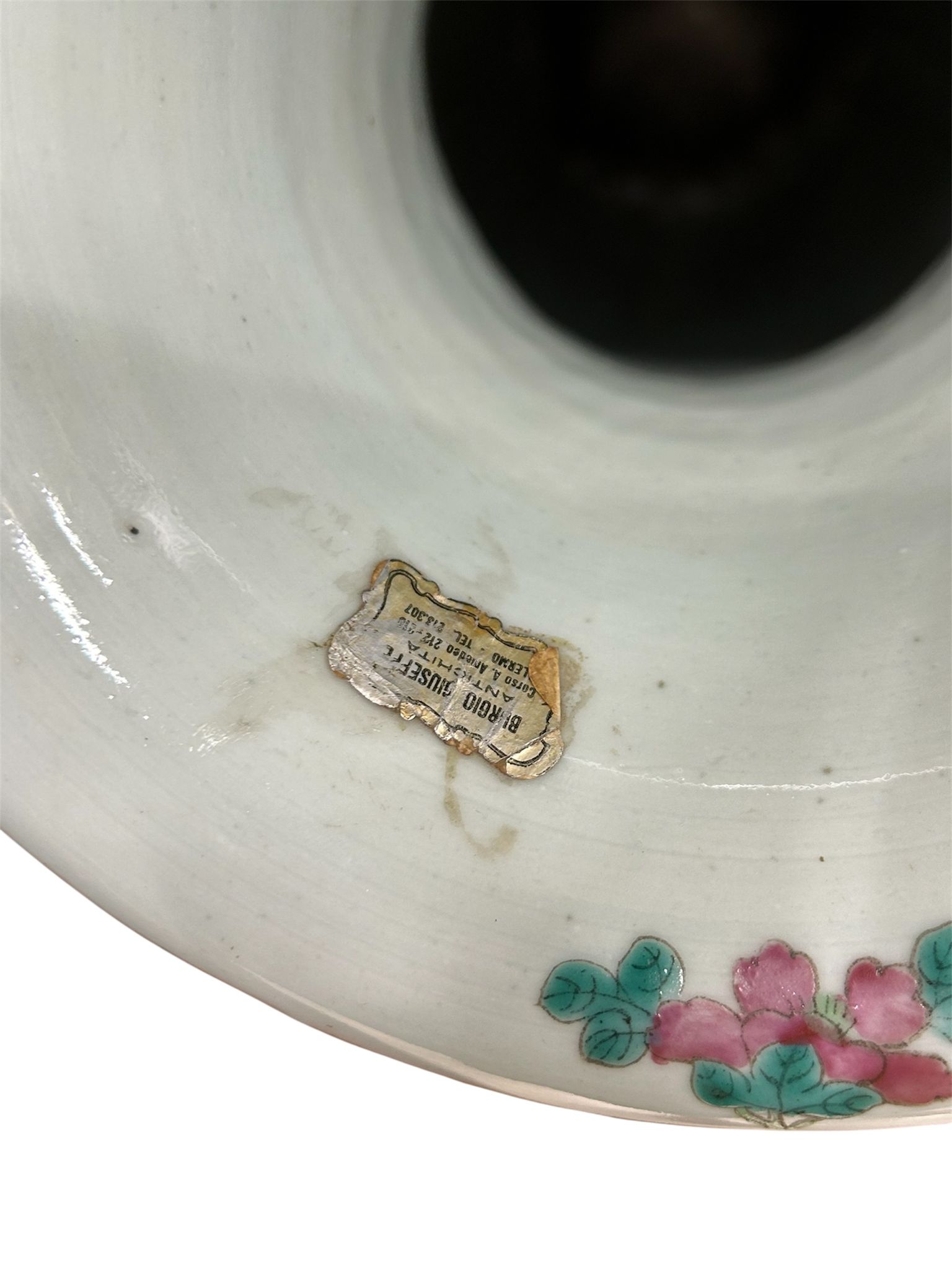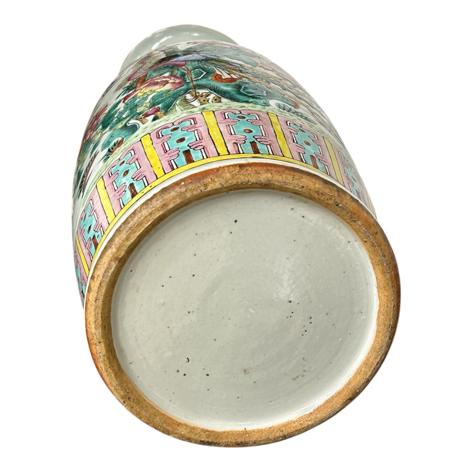 Coppia di vasi in porcellana della famiglia Rosa del XIX secolo, con decorazioni policrome a motivi orientali, faunistici e floreali. Posseggono le basi in legno coeve. Dimensioni: 23,5 cm x 61,5 cm